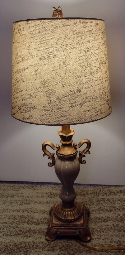 This is a very nice accent lamp that would look great in any room! It features a patterned shade with script and place names. The base is a decorative design with a square bottom. It's in great condition and ready to brighten up your space