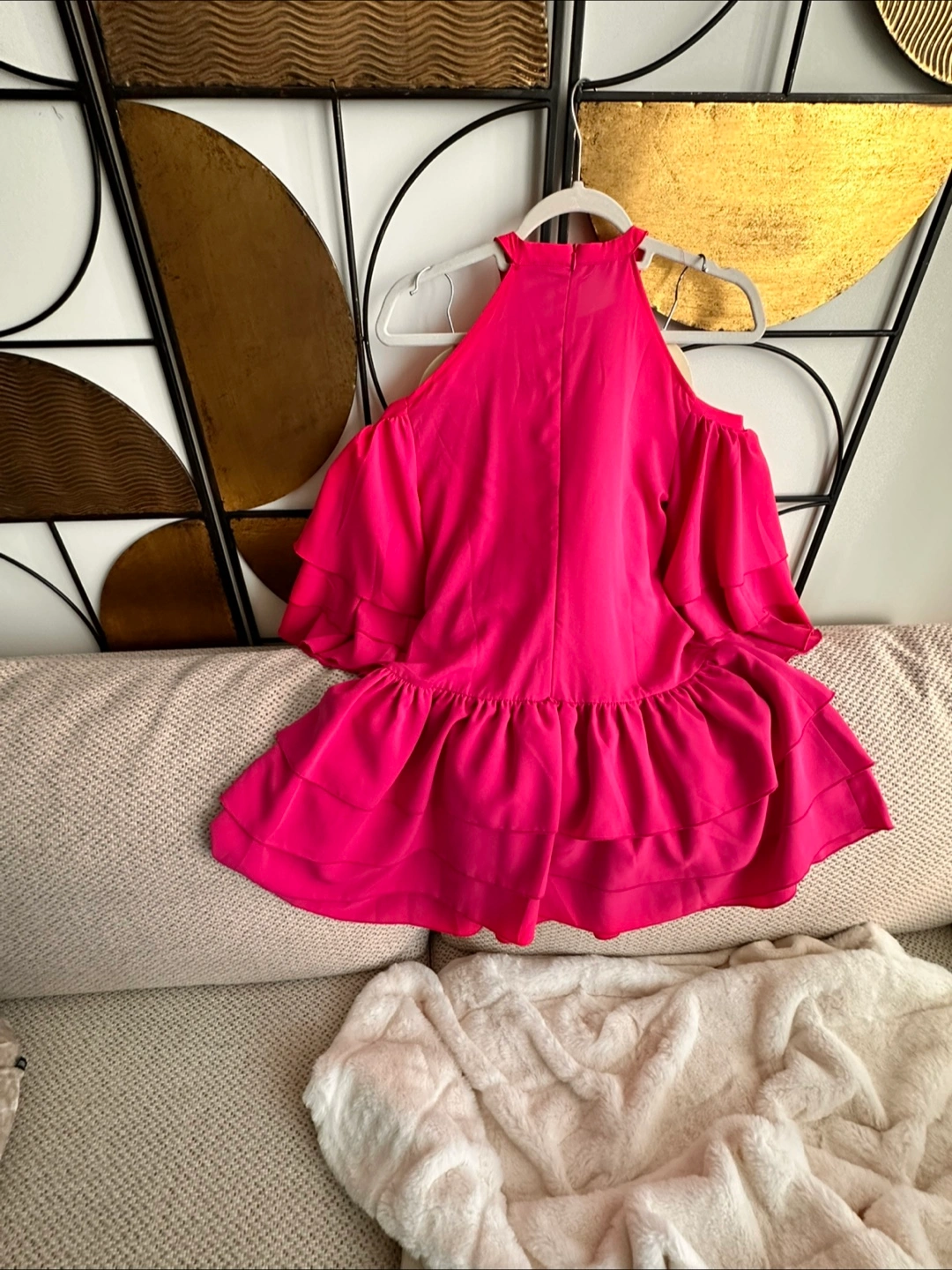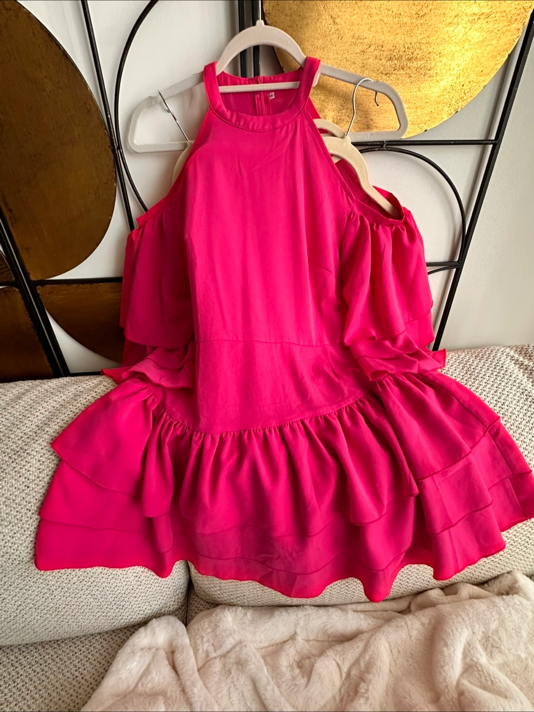 Selling a cute pink ruffle dress in size medium! It's in great condition and has a unique halter neck design with cold shoulder cutouts. Perfect for a party or special occasion! Boutique find