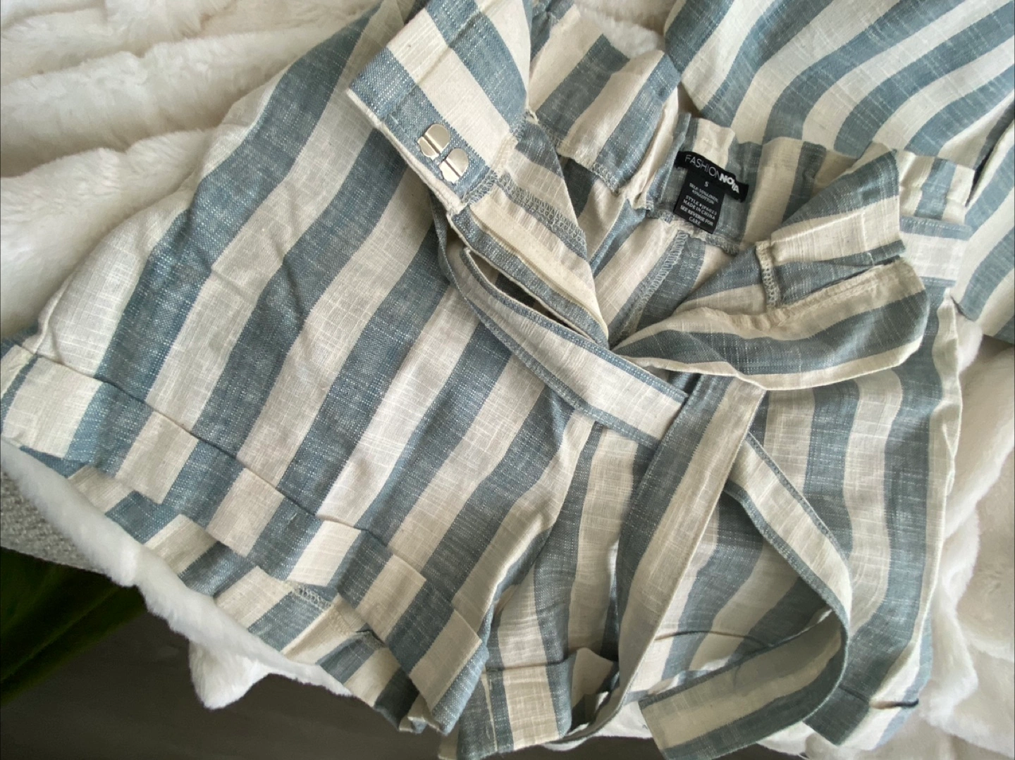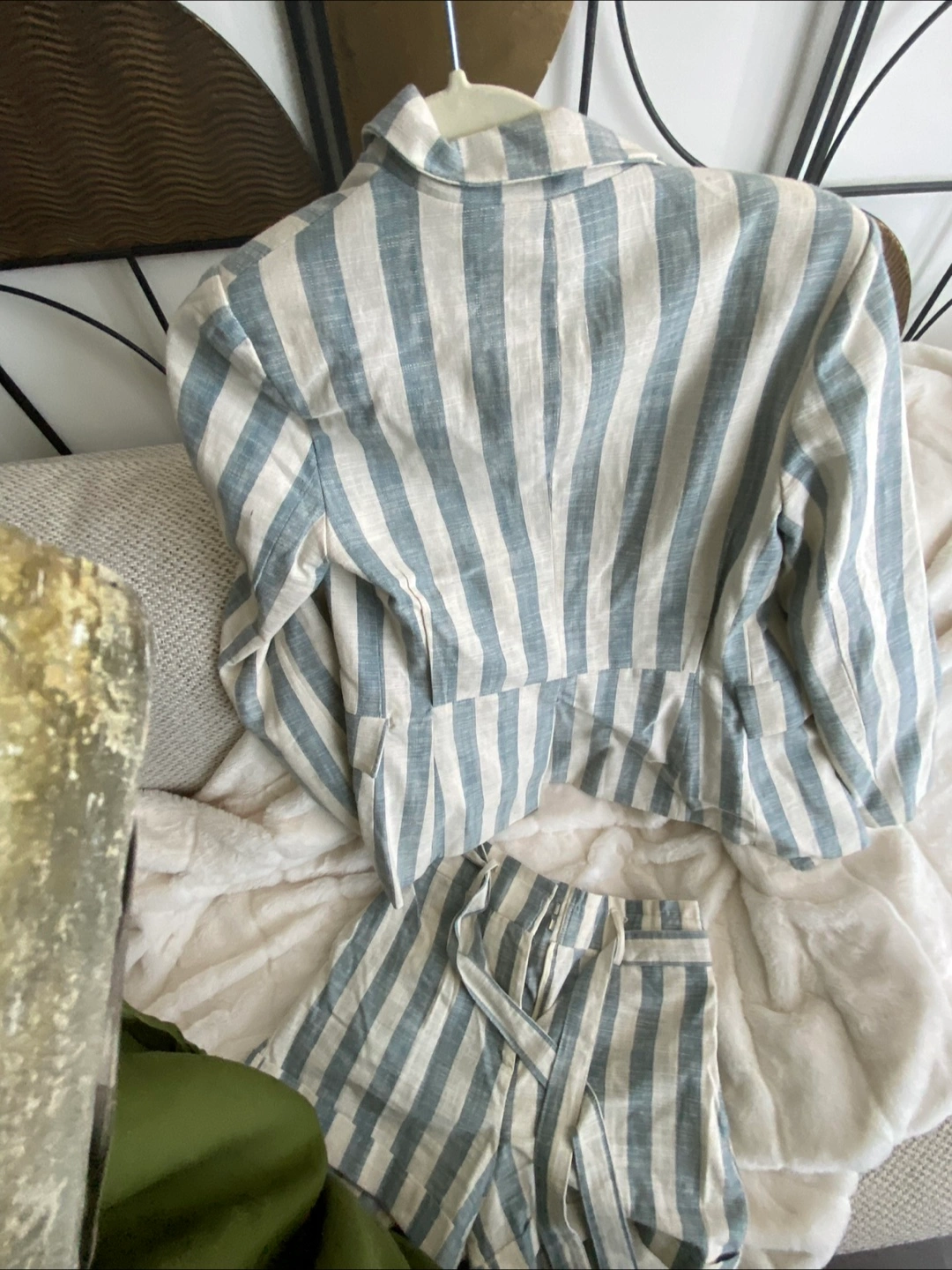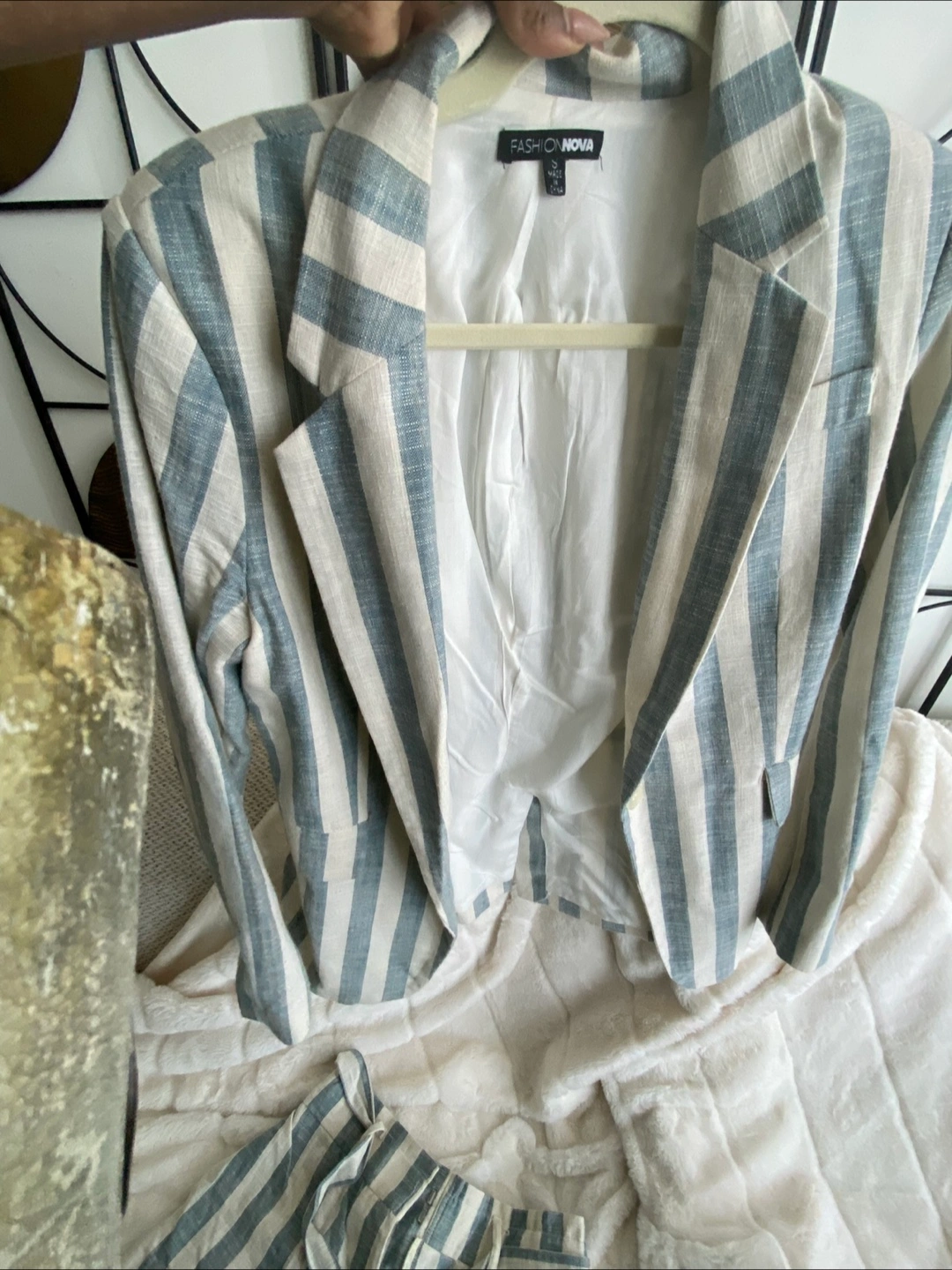 Selling a Fashion Nova linen blazer and shorts set in a stylish striped pattern! The set is a size small and would be a great addition to your wardrobe. The material is lightweight and perfect for warmer weather. The blazer is fully lined and the shorts have a cute tie waist detail.