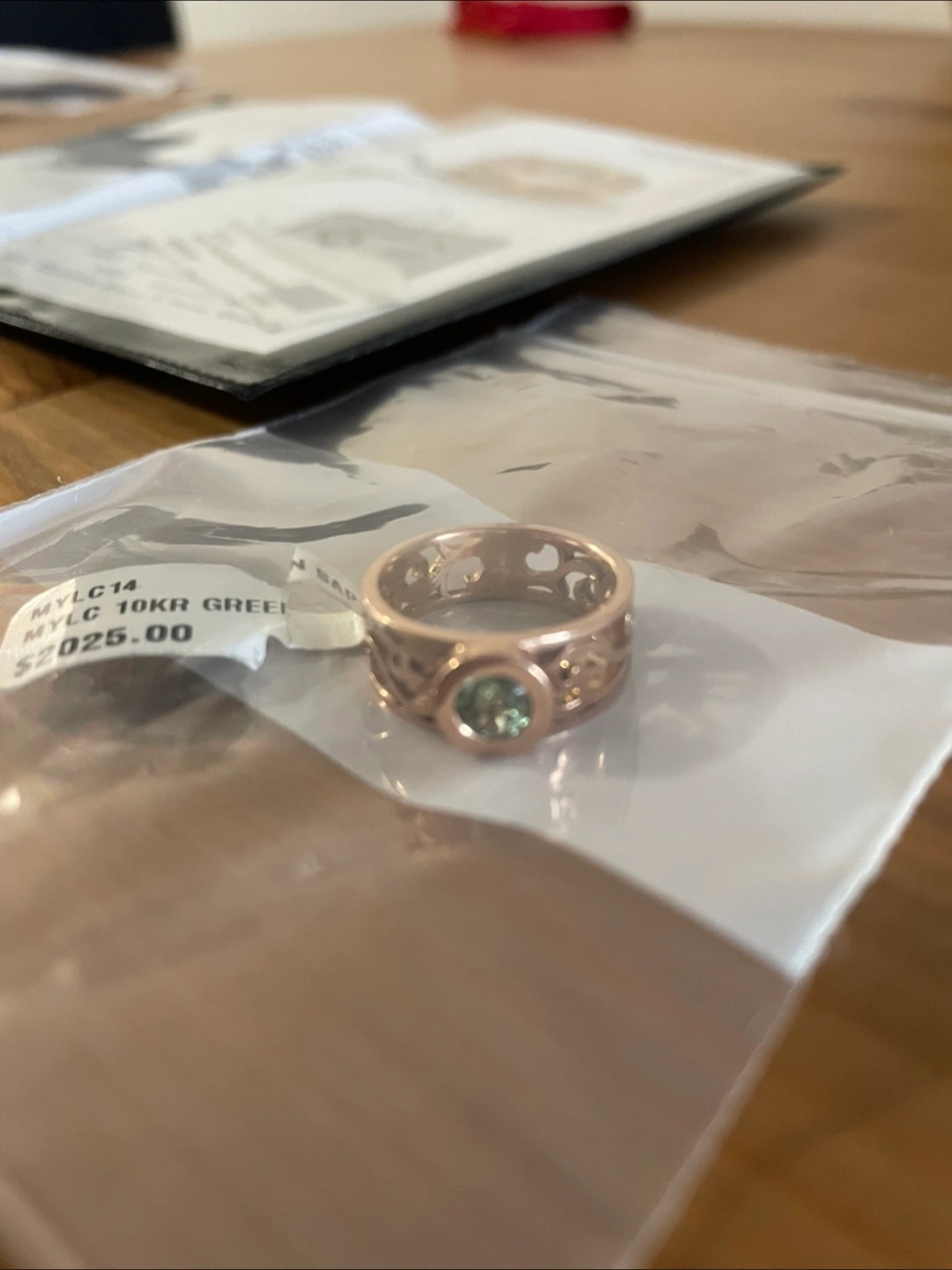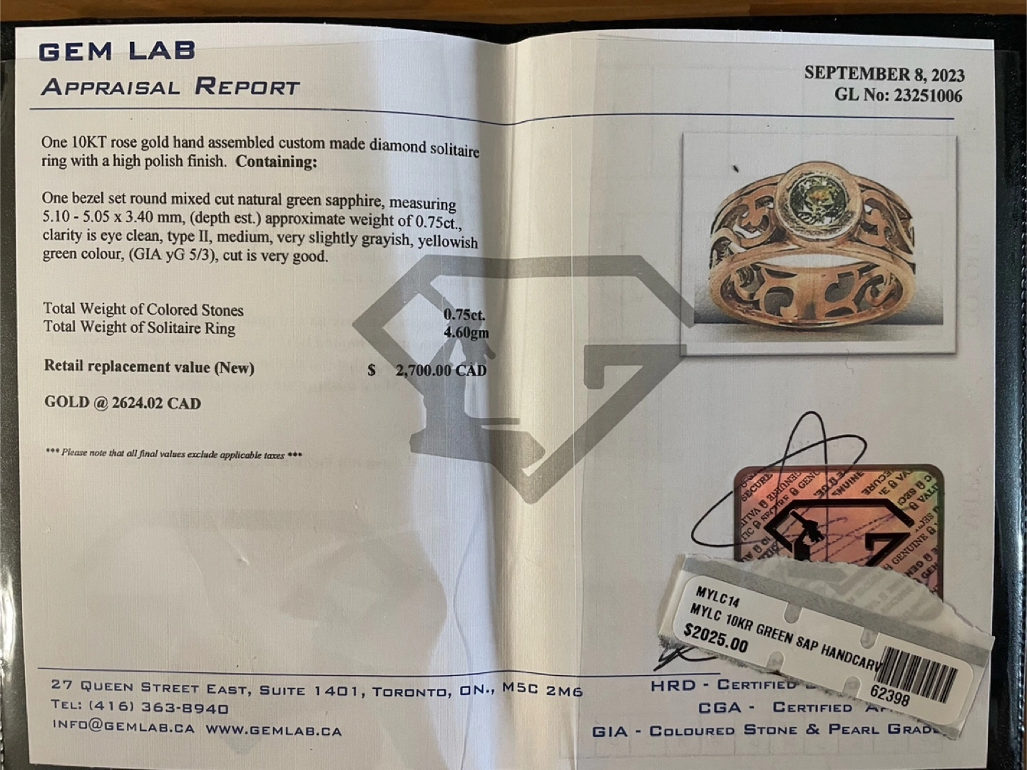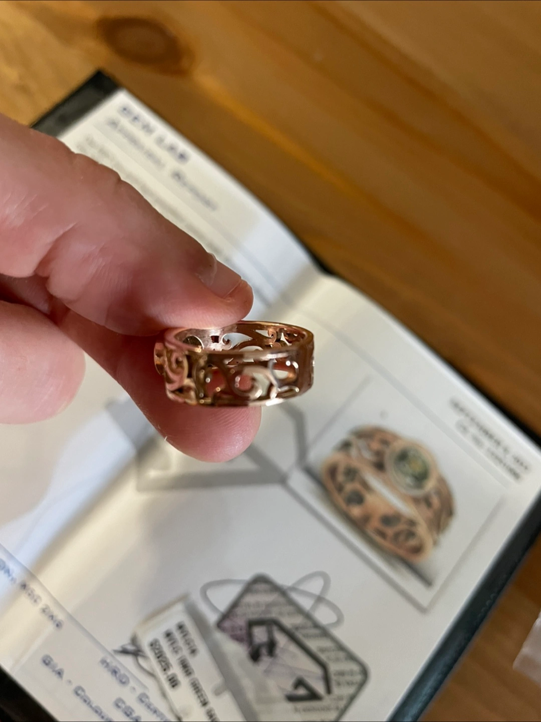 10KT rose gold handcrafted ring (see image of appraisal for more detail). This ring is much loved for its beauty and ornate craftsmanship and was purchased from Made You Look in Toronto. Size 5.