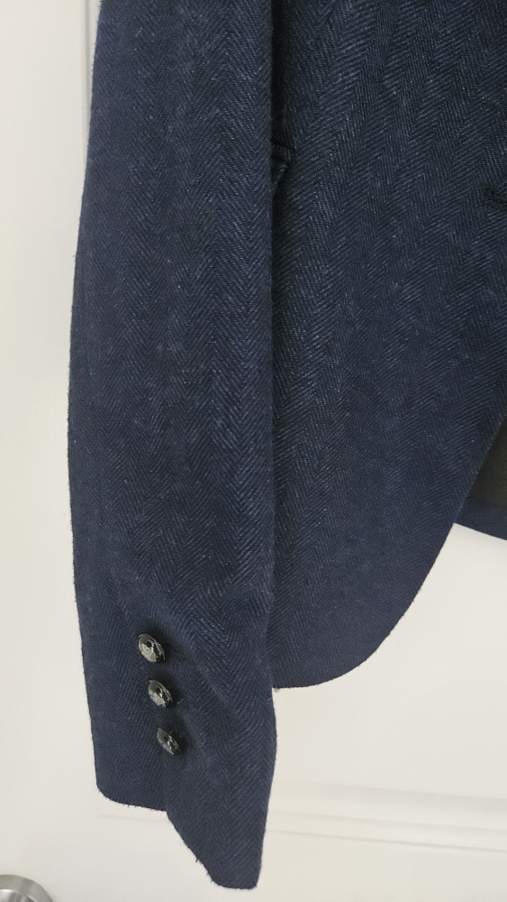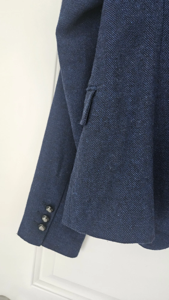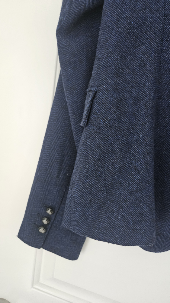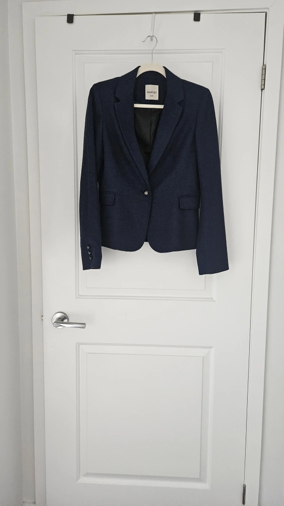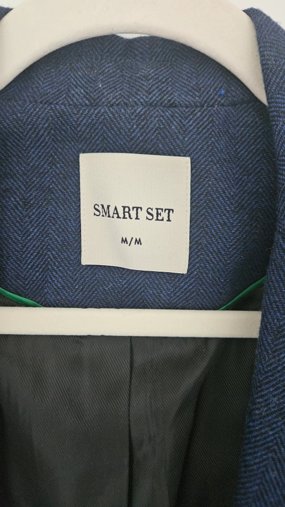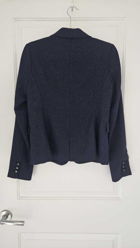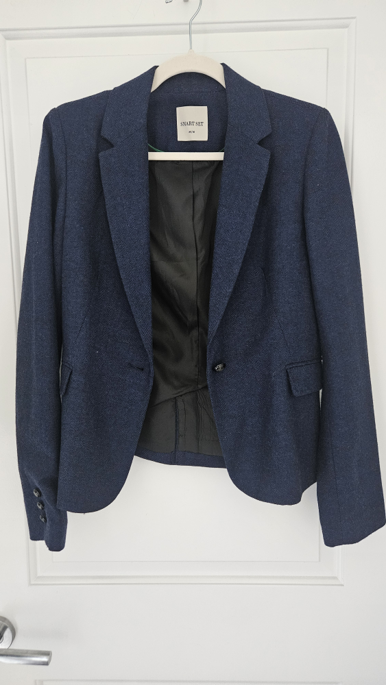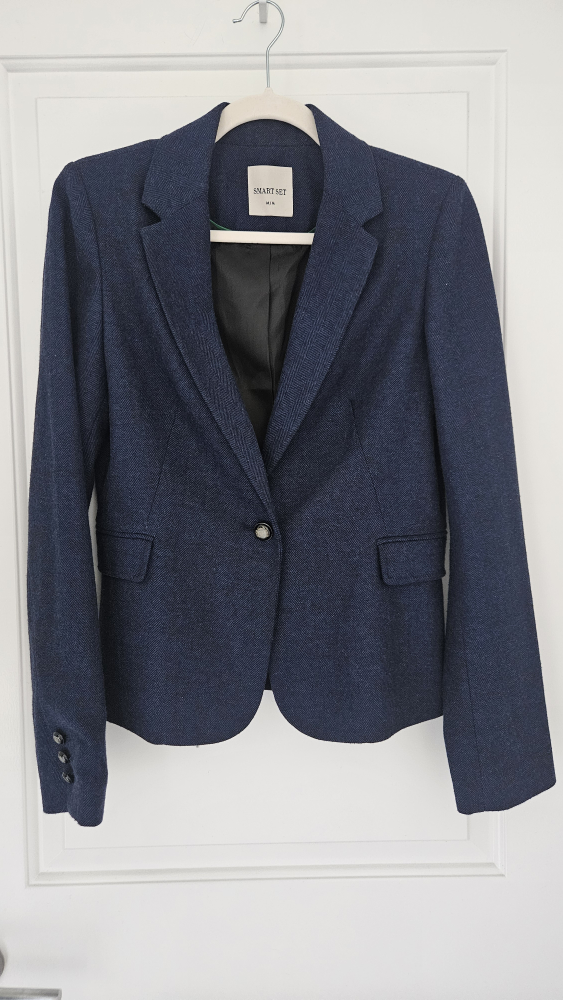 Selling a Smart Set blazer in size M/4-6. It's a stylish navy blue colour with a subtle herringbone pattern. The blazer is in great condition and perfect for dressing up or down!