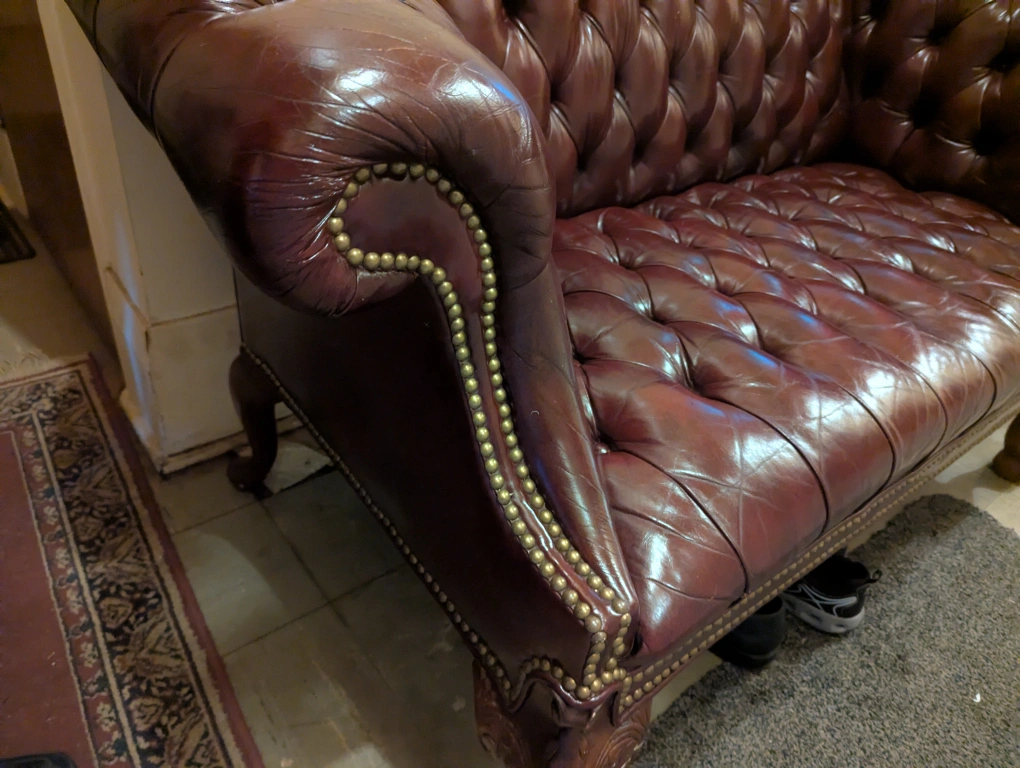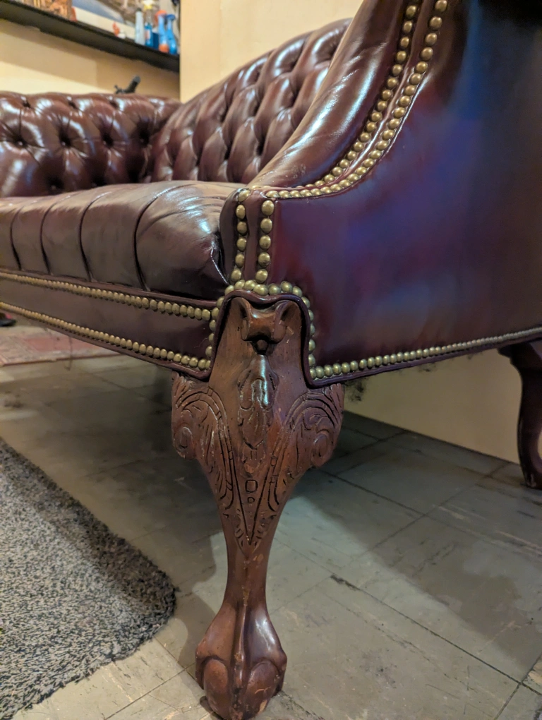 Selling a beautiful Regency Camel back chesterfield sofa in burgundy dyed leather. It's in great condition and has a classic, elegant look. The leather is soft and supple, and the tufted design adds a touch of sophistication to any room. The ornate legs give it a unique and stylish touch, there are a few minor scuffs on the front leg. Make me an offer, reasonable offers will be considered I need the money for rent more than I need the loveseat