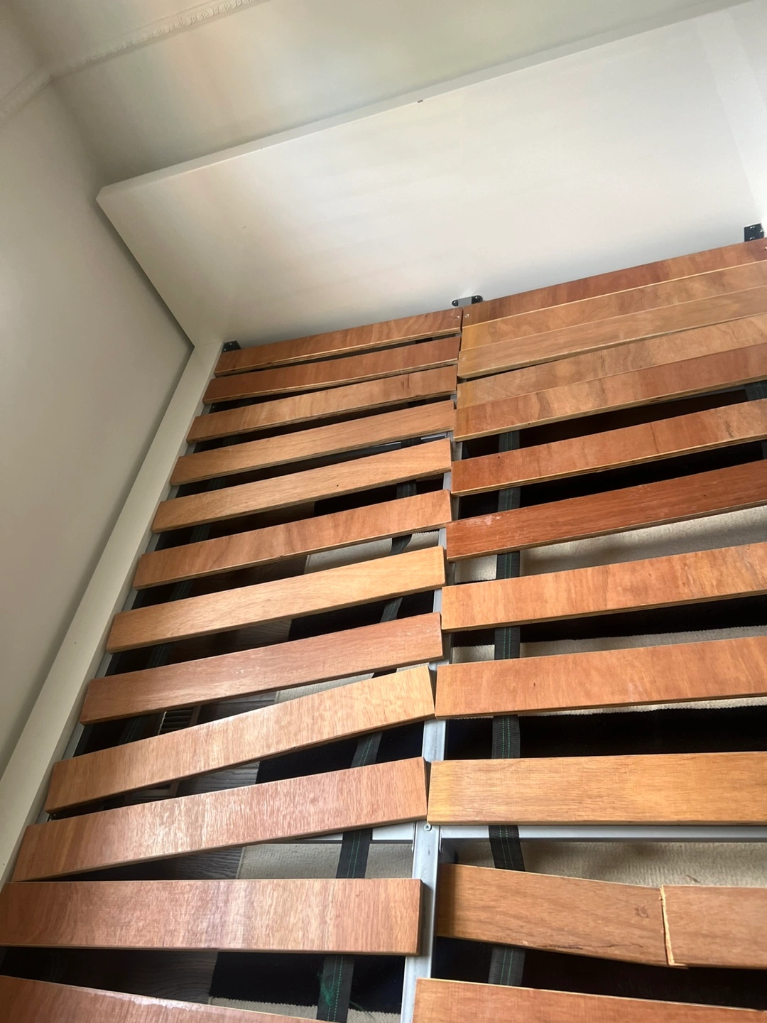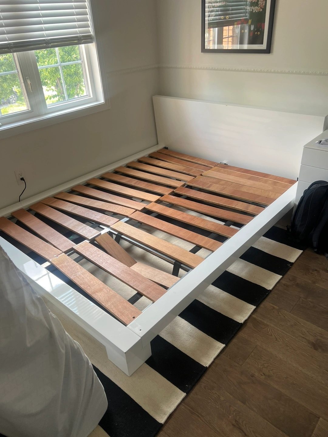 Very solid and heavy bed frame. Has some scuffs and one broken slat. This doesn’t affect the use. It will be disassembled with all the hardware included. Some screws may need to be replaced.