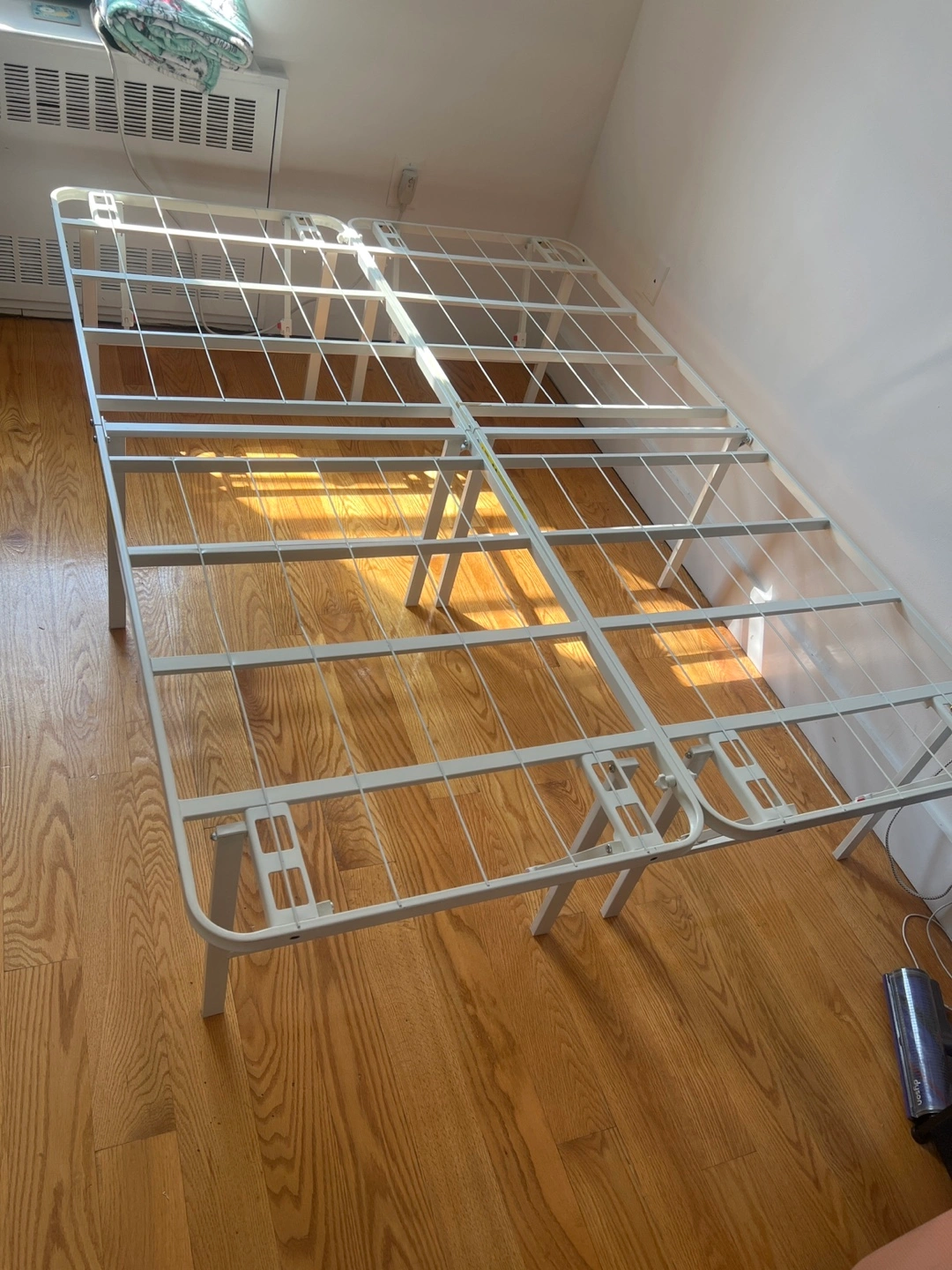 Selling a white metal bed frame (full). It's in good condition and ready for a new home! Super easy set up. High enough to fit storage tubs underneath. Pick up in Harlem near 2/3 train. Decently light, easily transportable via train.