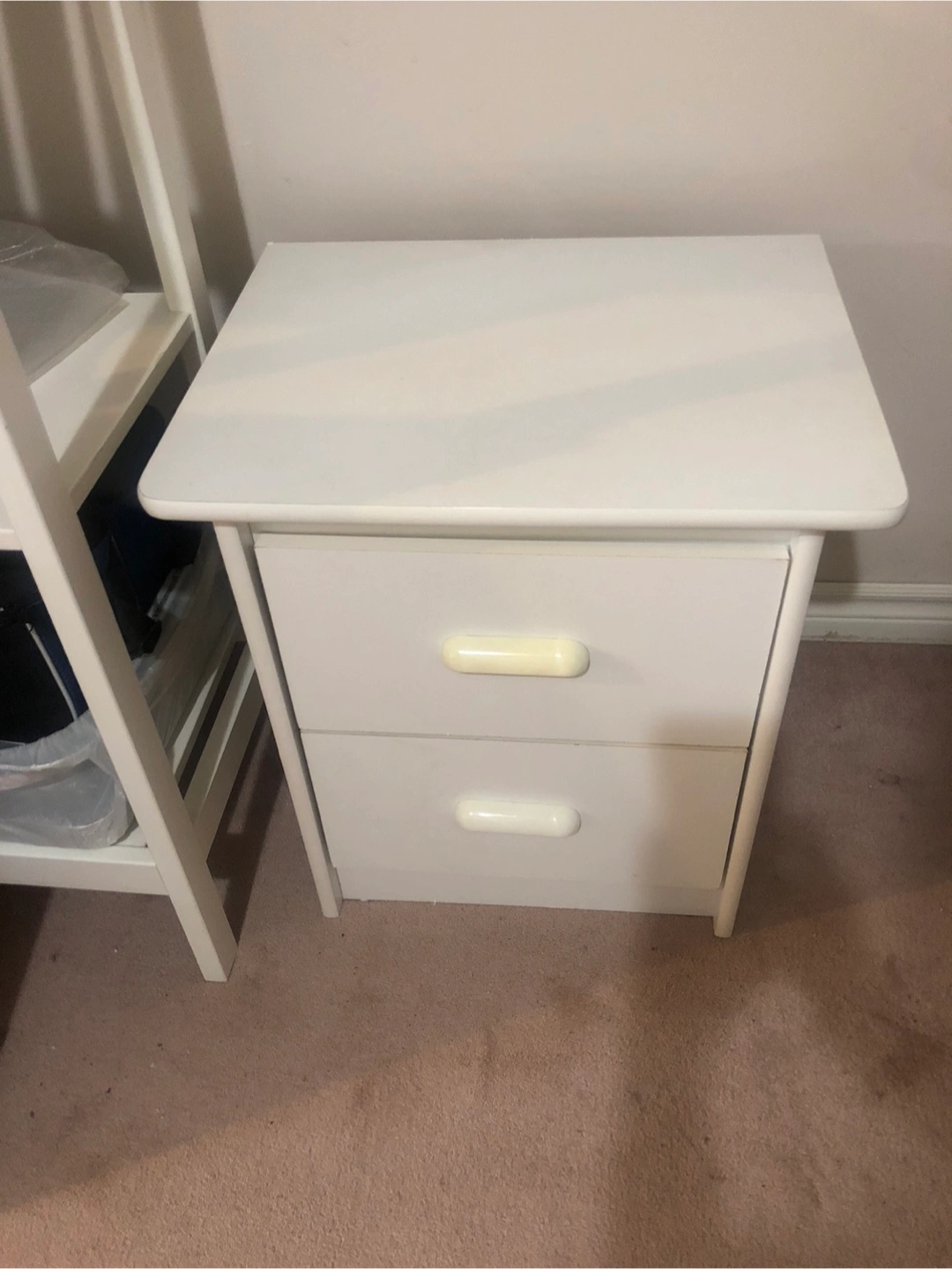Here's a solid white nightstand with two drawers! Very clean. It's perfect for keeping your bedside essentials close at hand. The drawers slide smoothly, and it's in great shape for its next home