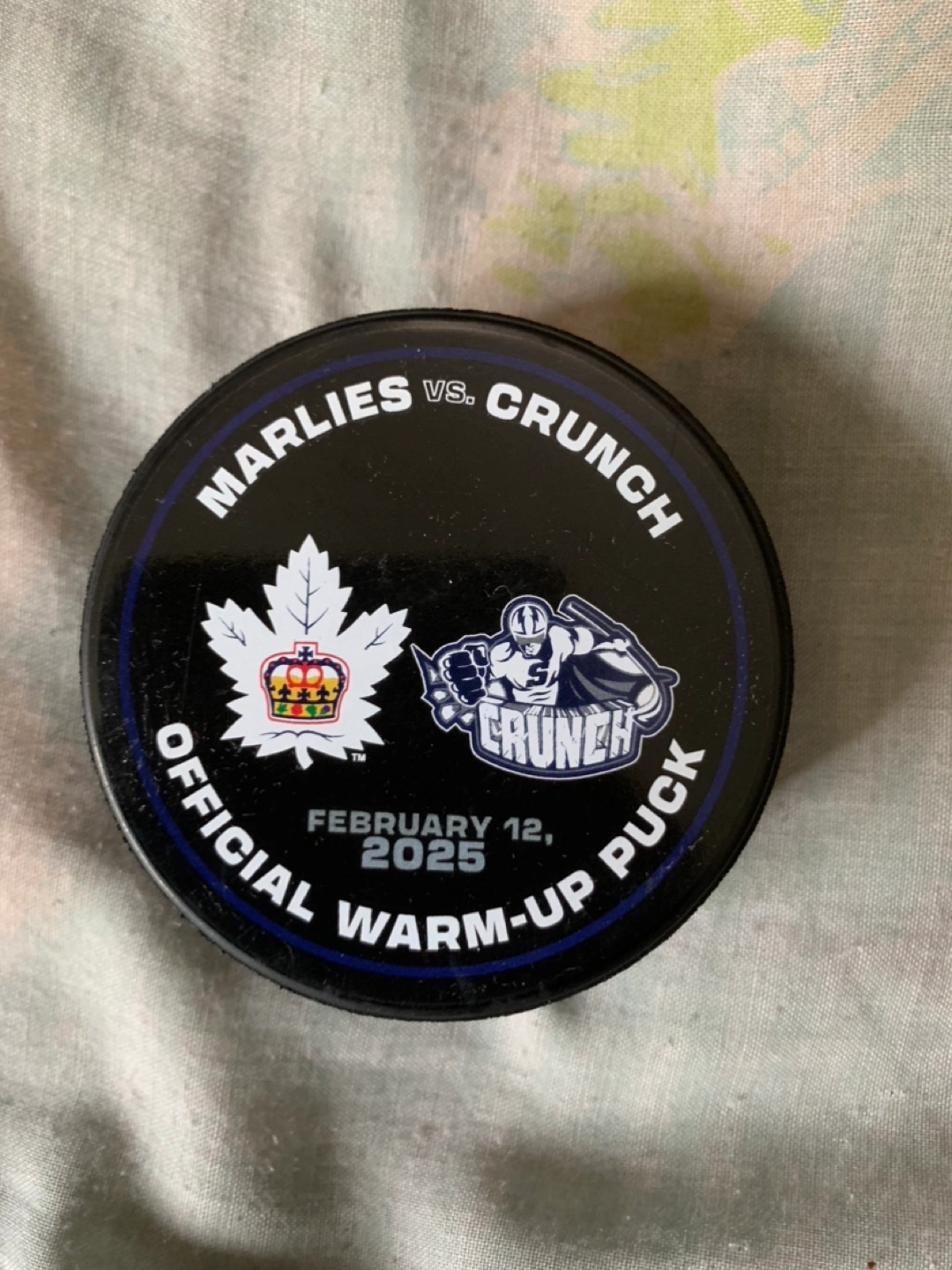 Selling an official warm-up puck from the Marlies vs Crunch game! It's in great condition and features the logos of both teams. A cool piece for any hockey fan!