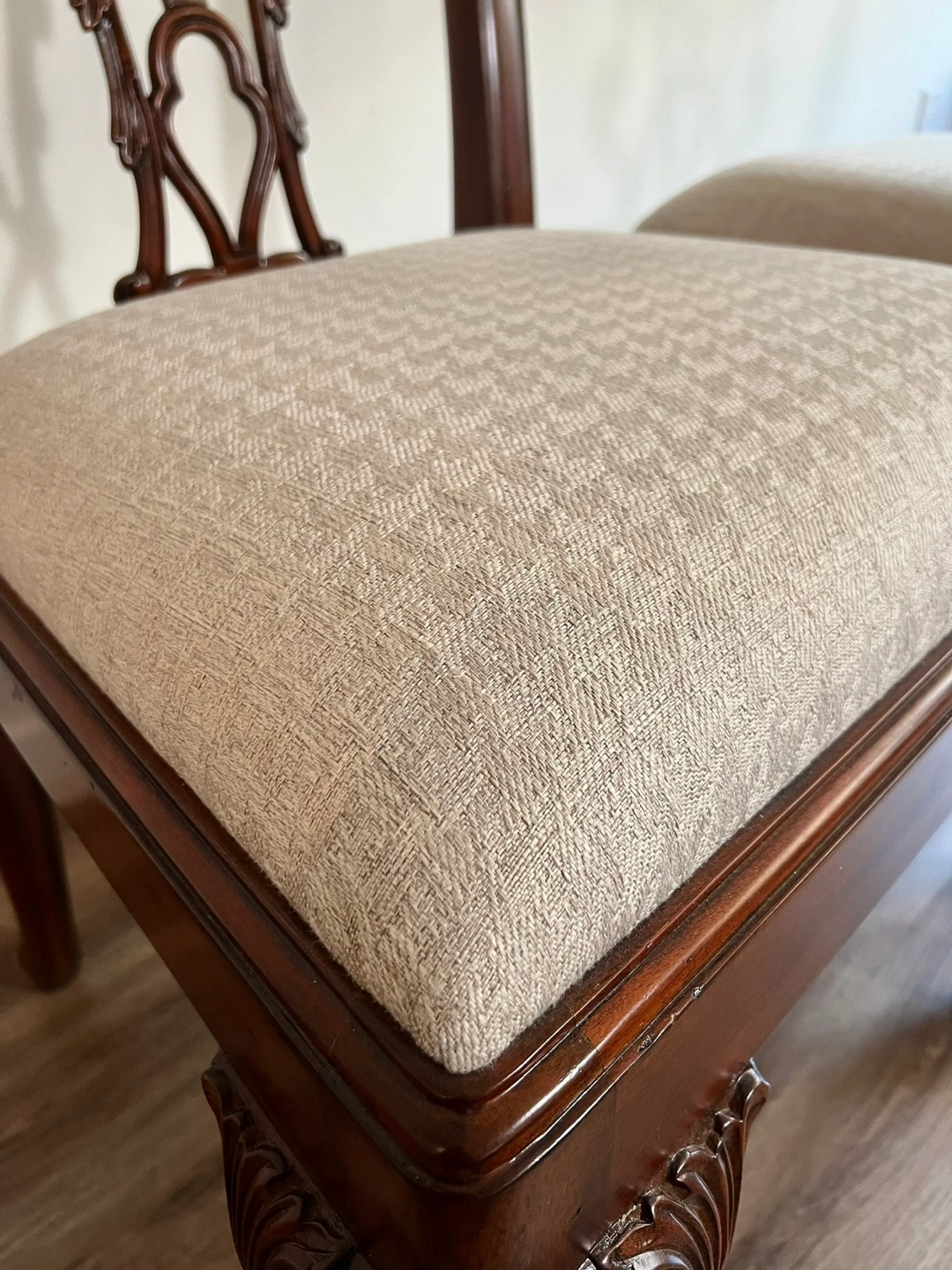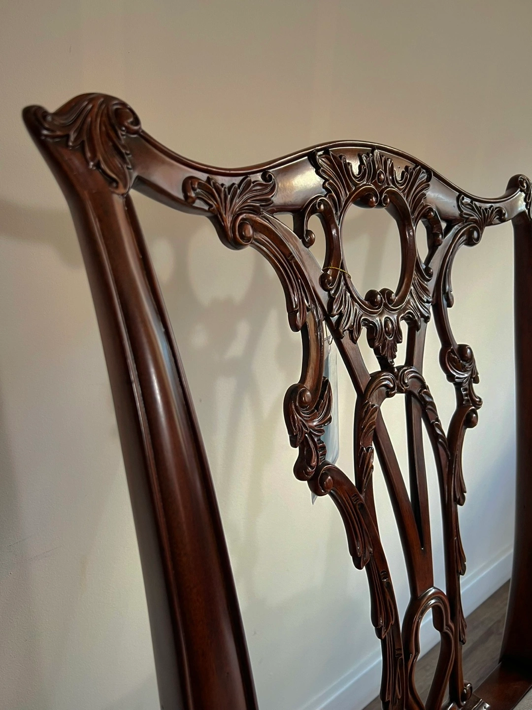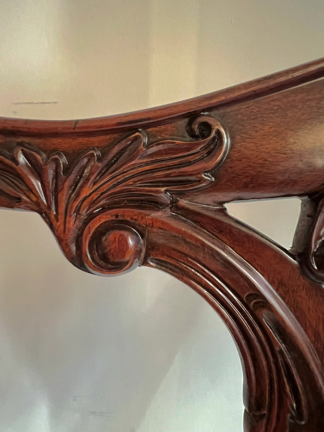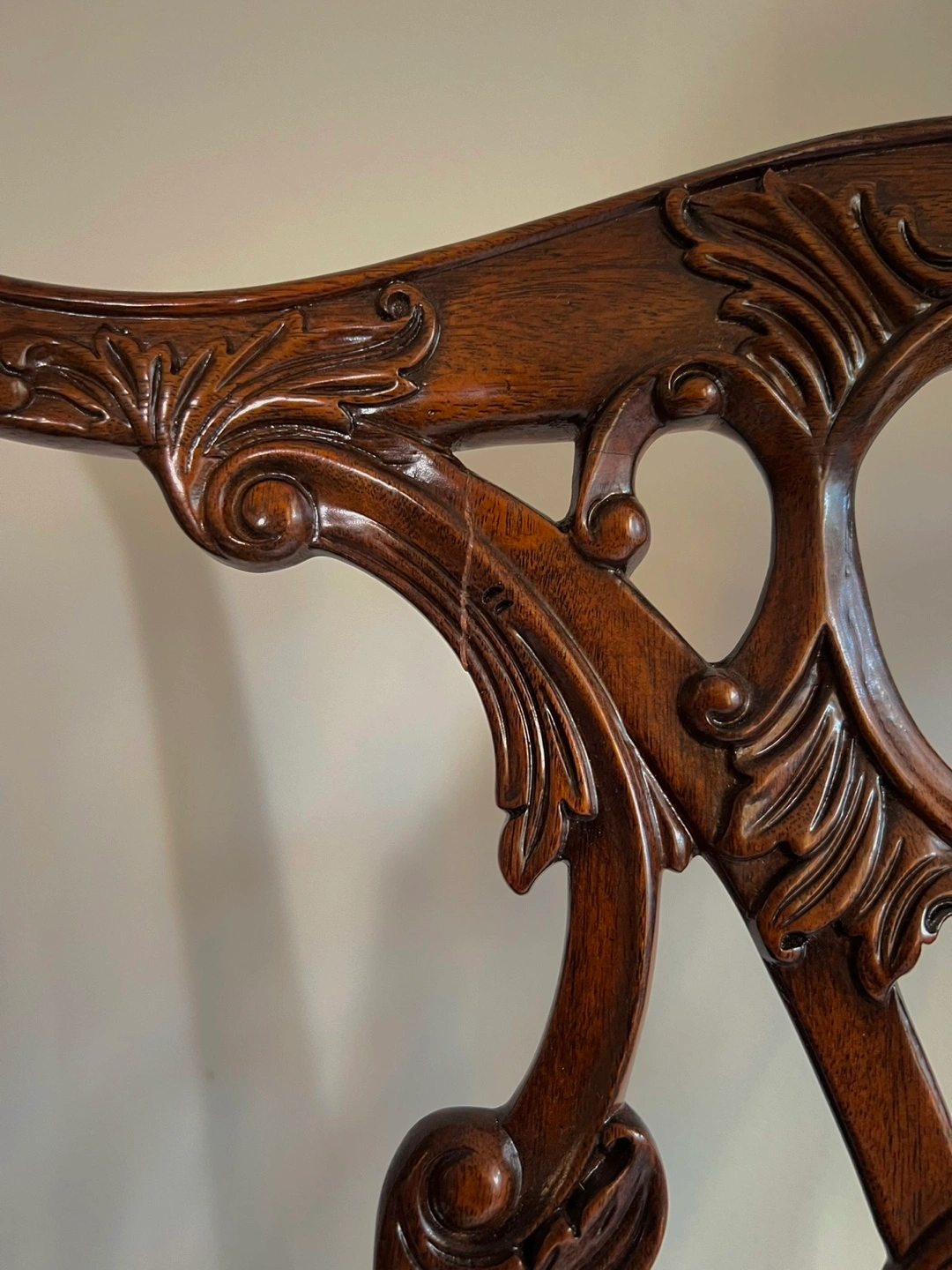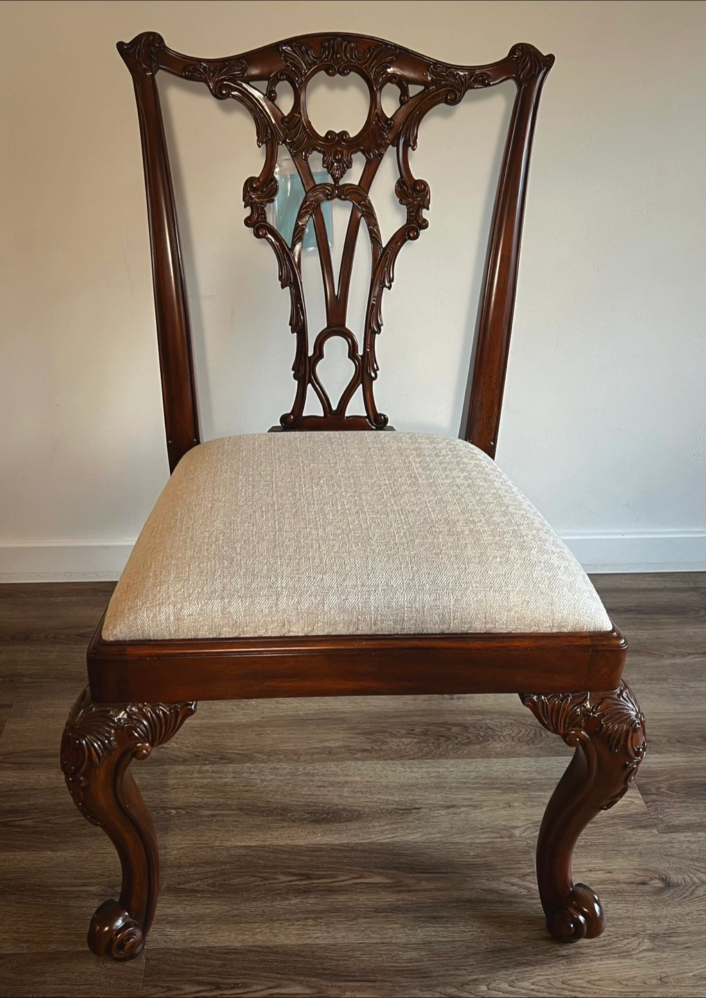 A hand carved Rococo side chair, the pierced vase splat back above an upholstered drop in seat, on cabriole legs with scroll feet. The original George III after Thomas Chippendale, circa 1760.