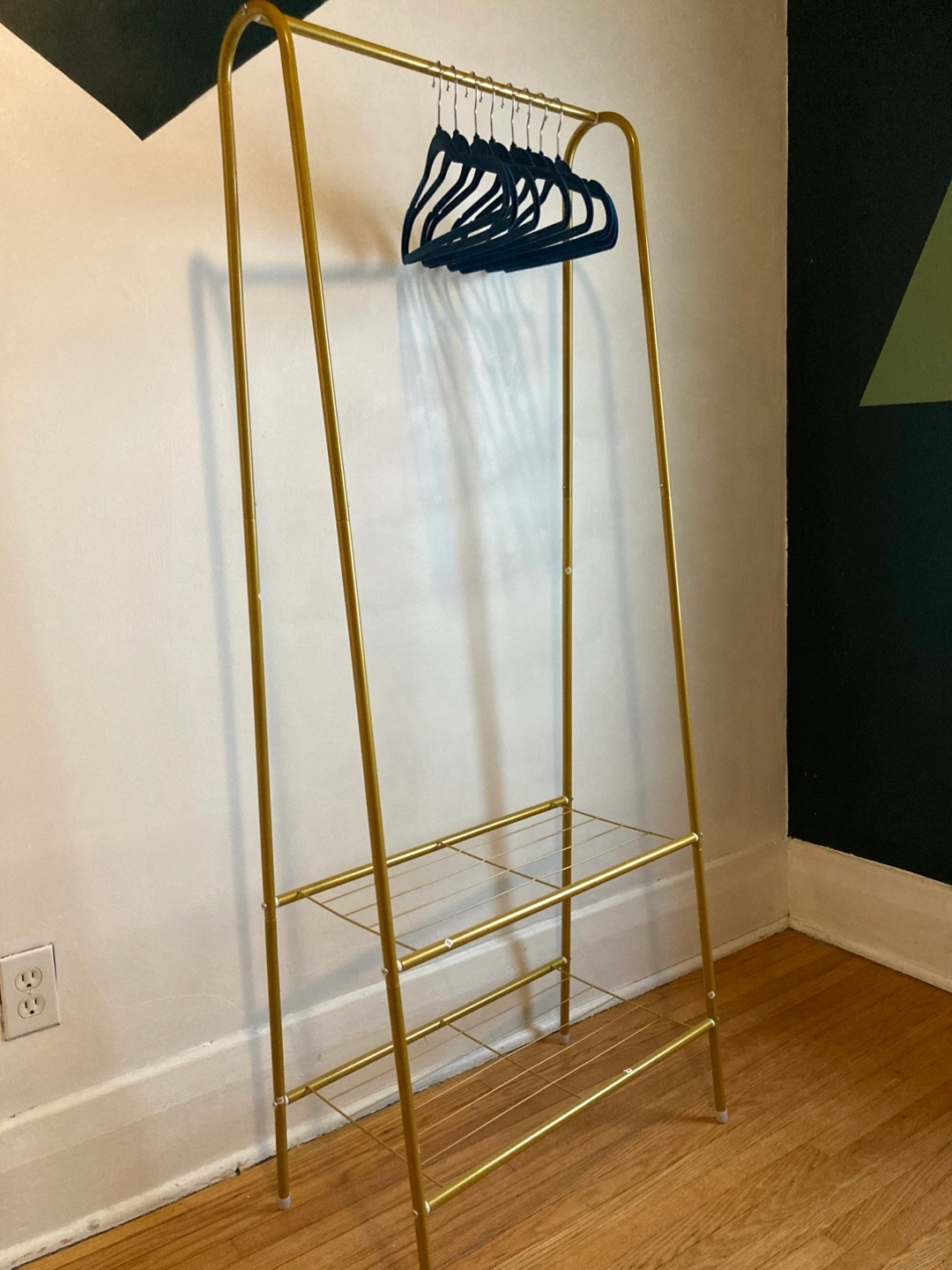 Selling a gold-coloured garment rack that comes with shelves. It's perfect for adding extra storage and hanging space to your room. Great for organizing clothes and accessories!