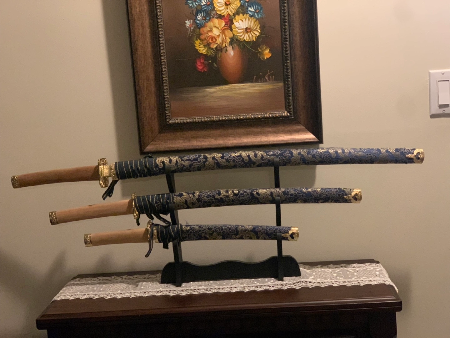 111Selling a decorative katana sword set, including three swords of varying sizes displayed on a stand. The swords feature wooden handles and sheaths with a blue and gold dragon pattern. Perfect for adding a touch of elegance to your home decor! Longest one a little bit bend.