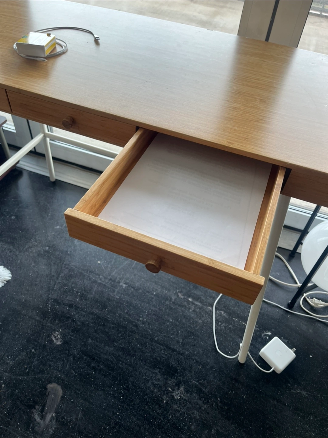 Lillåsen Ikea desk made of bamboo surface with three drawers that fit regular sized paper.