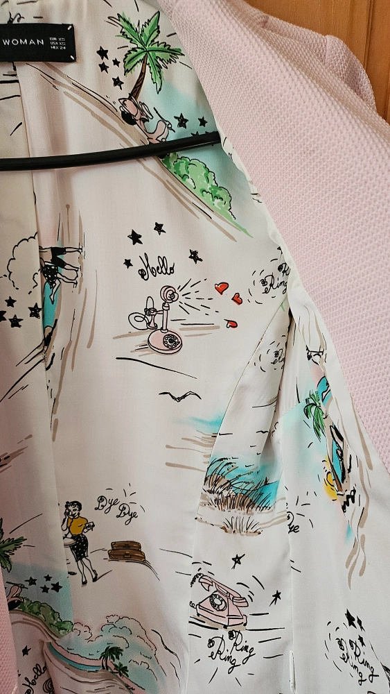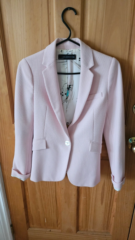 Selling a cute Zara Woman blazer in a light pink colour! It's a size XS and has a fun, patterned lining. Perfect for adding a pop of colour to your outfit.