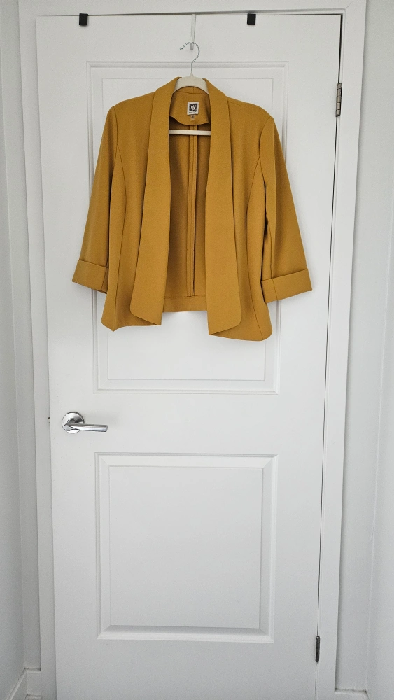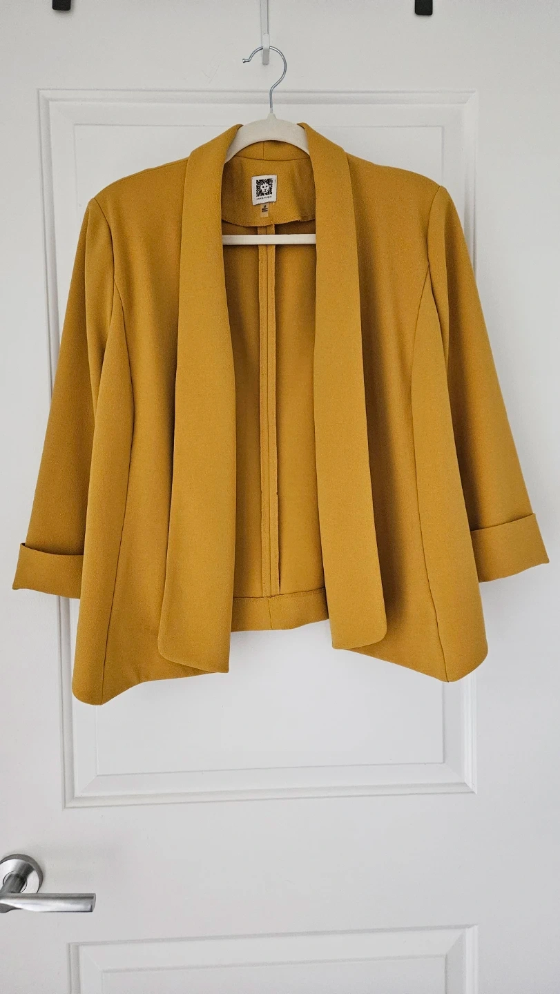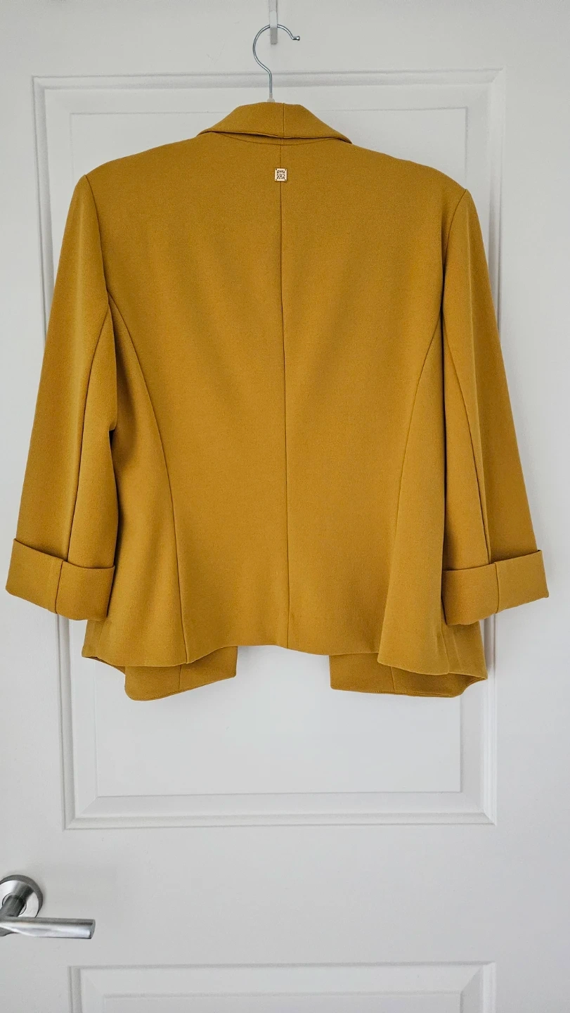 Price is NEGOTIABLE. Here's a lovely Anne Klein blazer in a size medium (note that this fits as a big medium or large)! It features a unique open-front design and a beautiful mustard yellow colour, perfect for adding a pop of colour to any outfit. It's in great condition and ready for a new home. Perfect for work, dress up or down for this summer!