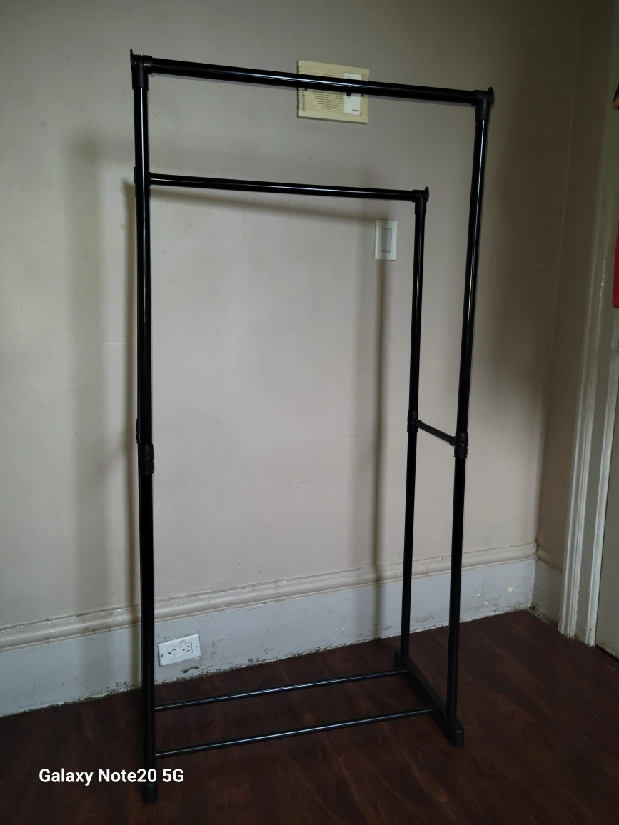 Selling a handy black clothing rack with a double rod! It's perfect for organizing your clothes and maximizing closet space. Great for small apartments or anyone needing extra storage. It's in good condition and ready for a new home!