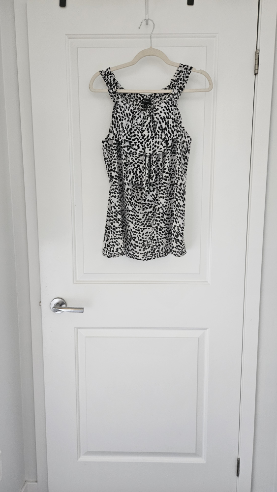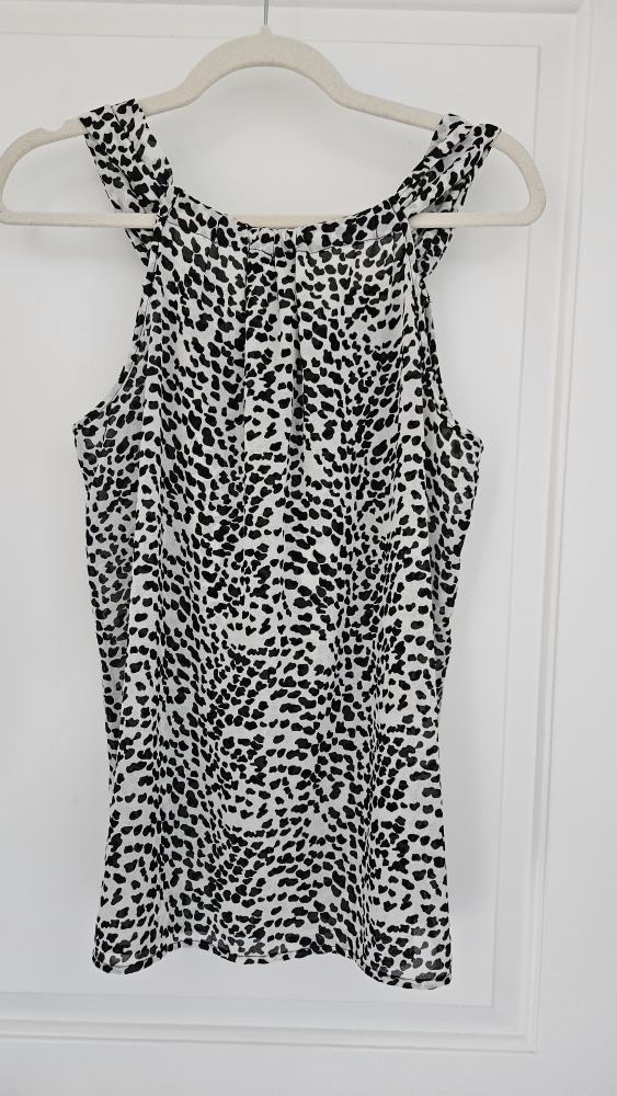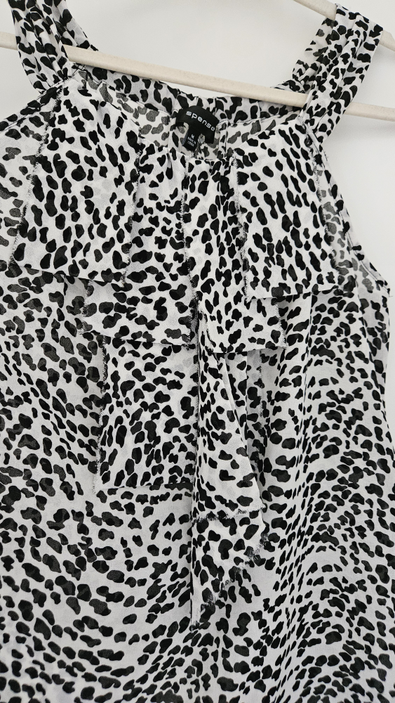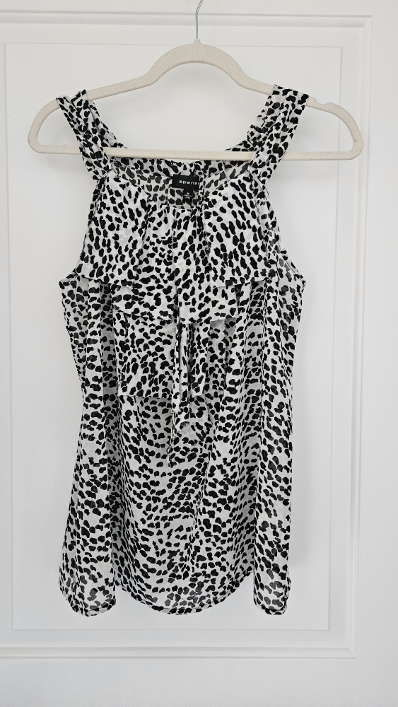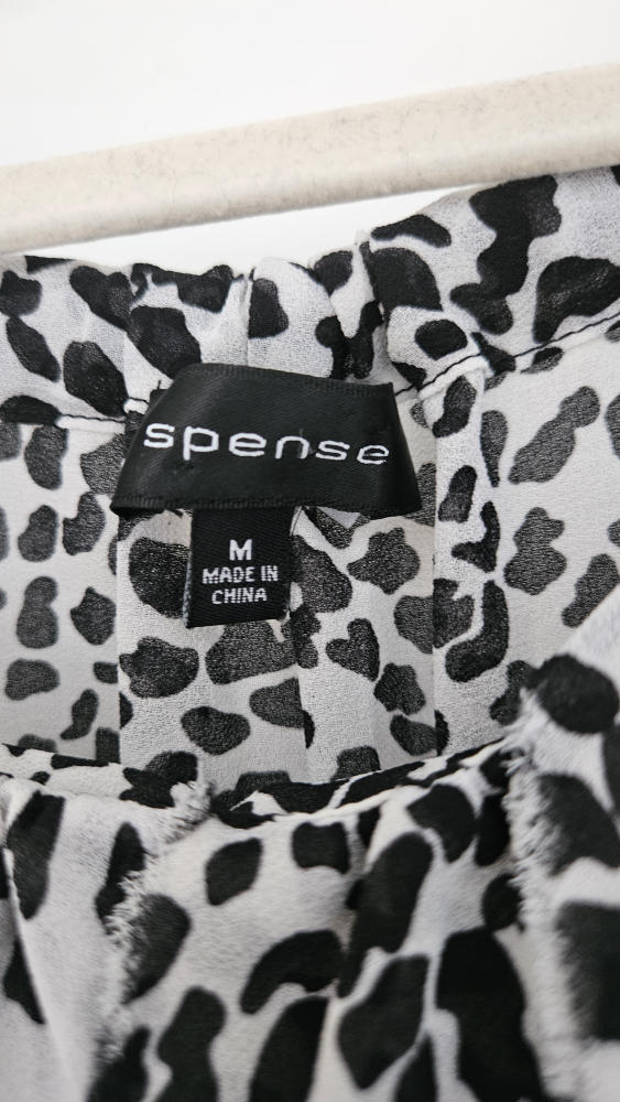 Here's a cute Spense top with a black and white print! It's a size medium and in great condition. Perfect for adding a bit of style to your wardrobe this summer.