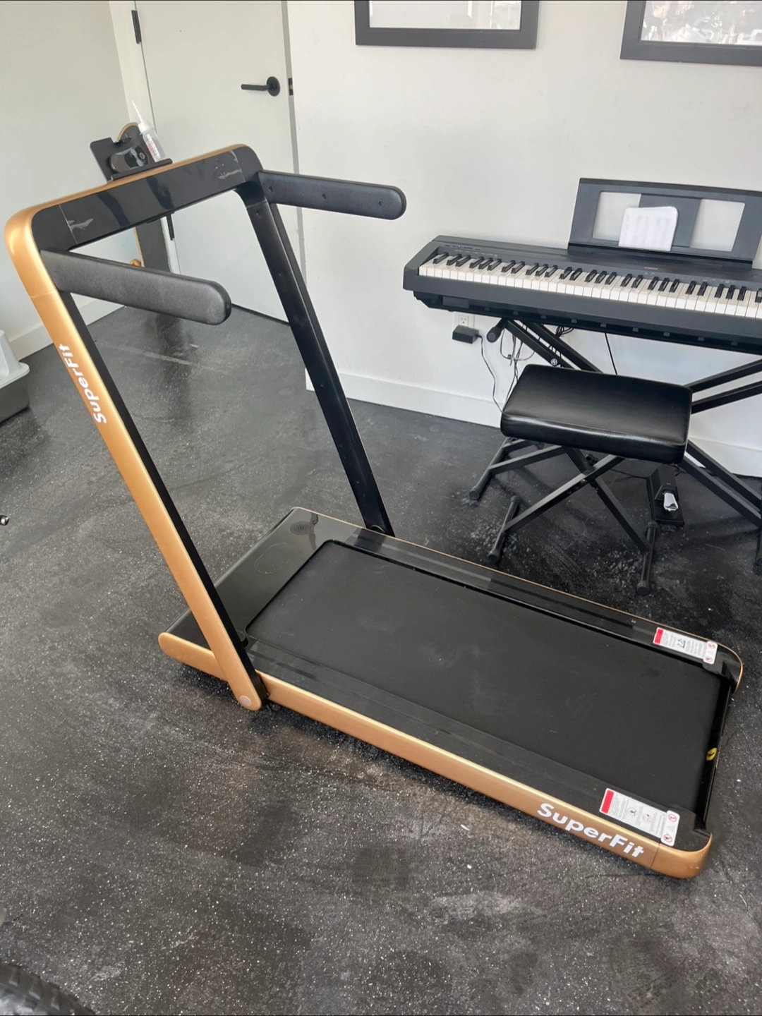 Compact and slim Treadmill that can be stored under the sofa or bed. Can be used with the support arms up or down.