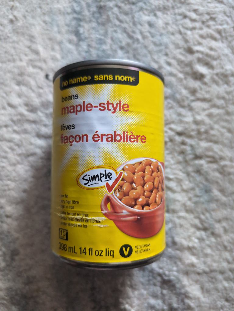 Selling a can of No Name maple-style beans! It's a 398 mL can, perfect for a quick and easy meal. These beans are vegetarian, low in fat, and a very high source of fibre and iron