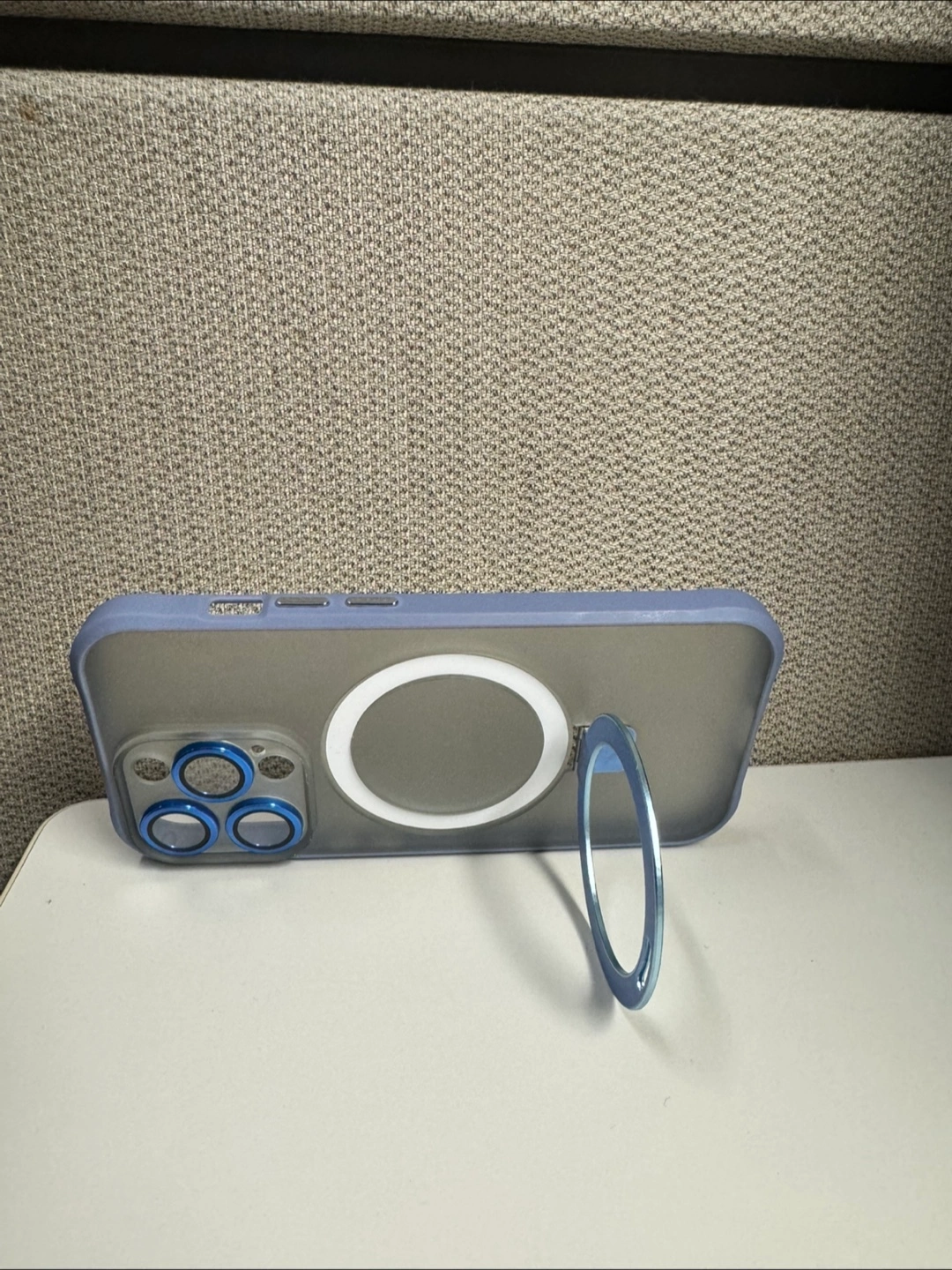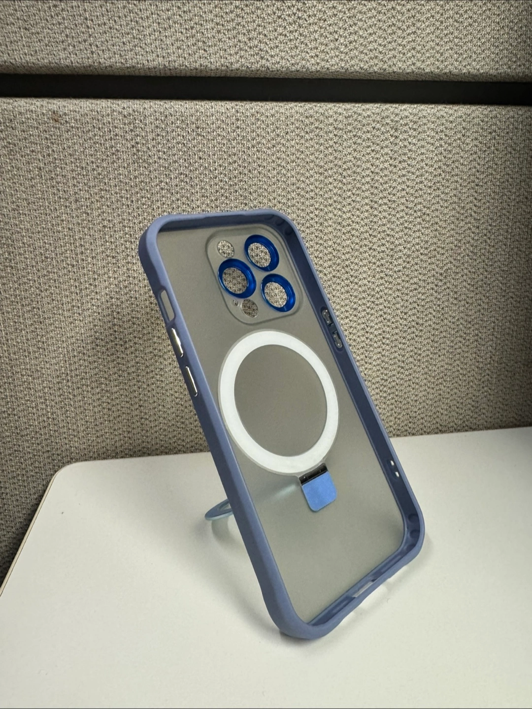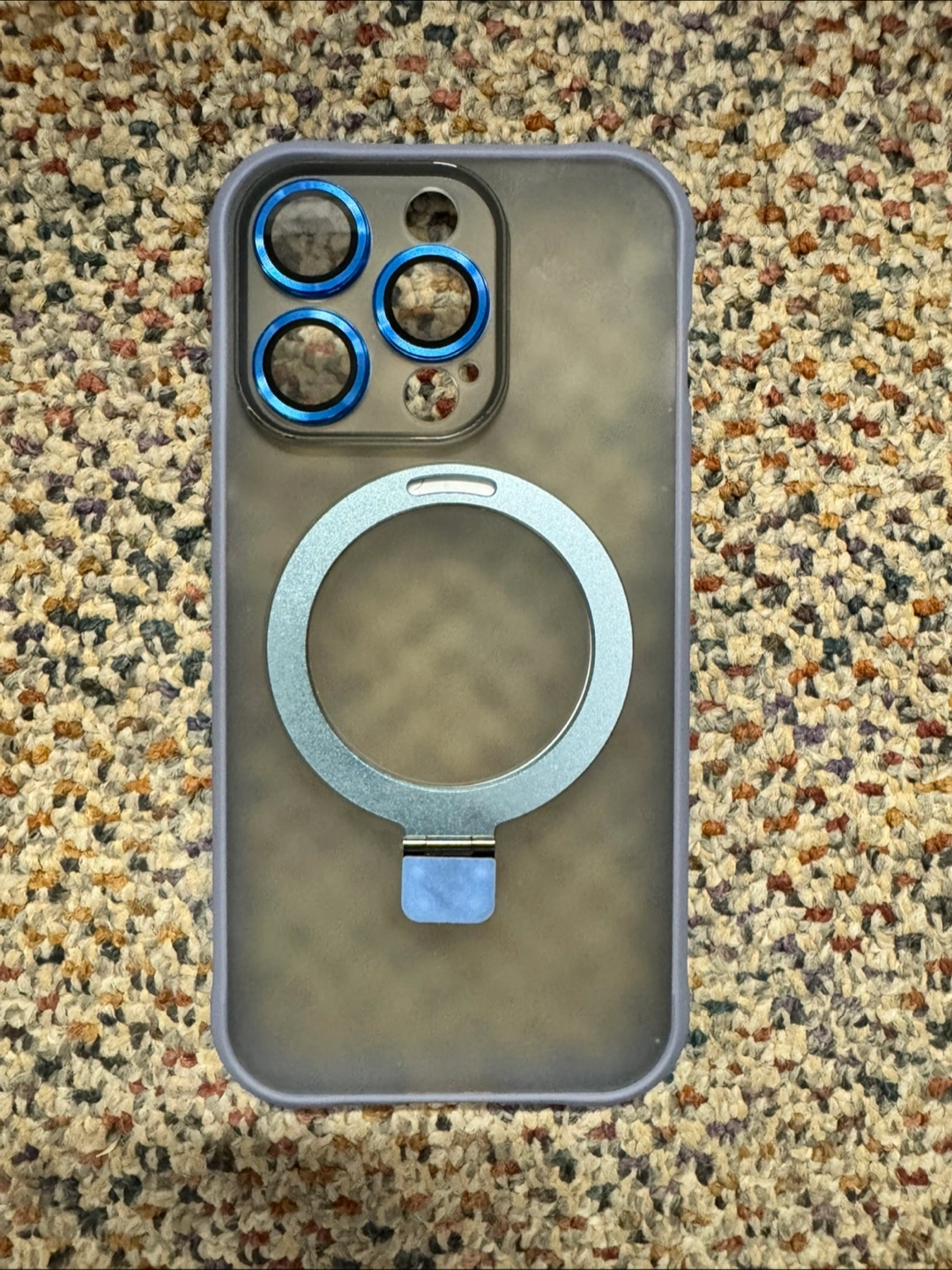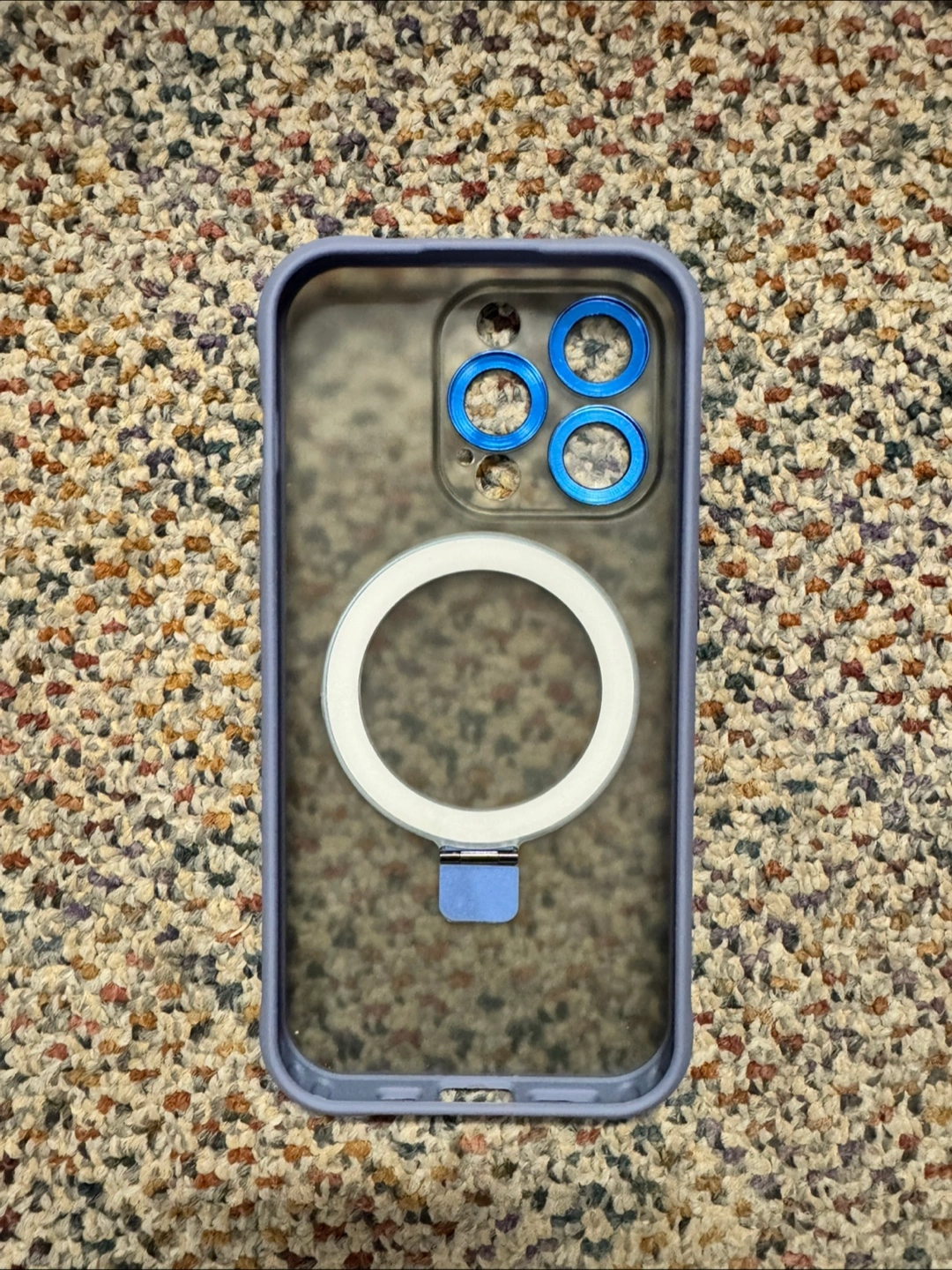 1000+Selling an iPhone 15 Pro case that comes with MagSafe compatibility and a built-in stand! The case is a clear/frosted colour with blue accents around the camera and edges. It's in great condition and ready for a new phone!