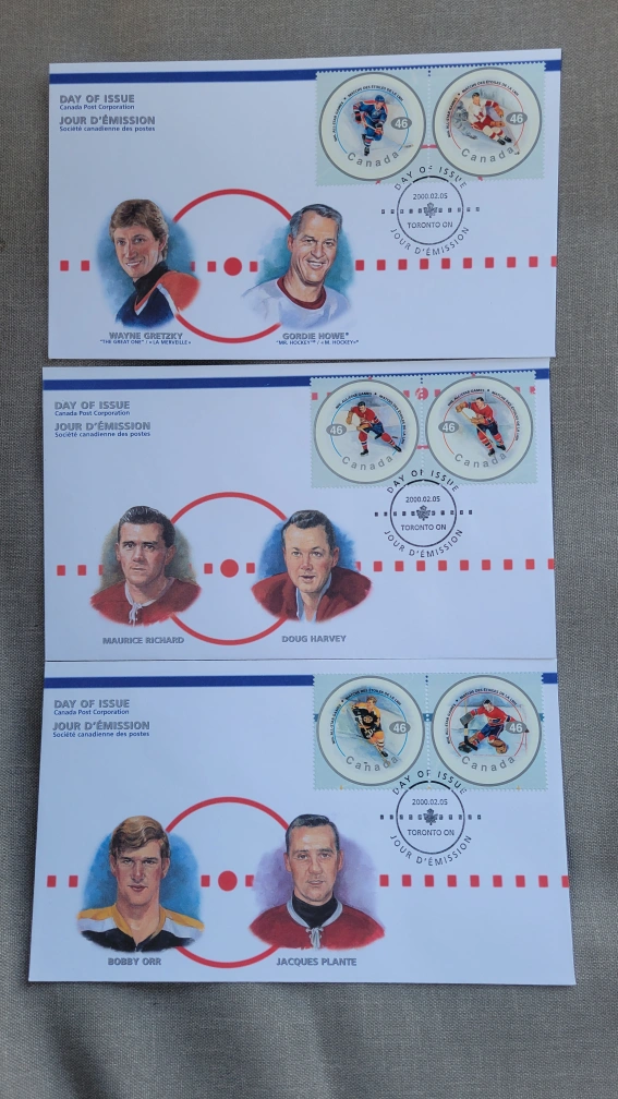 Selling a set of 3 Canadian FDCs featuring hockey legends. These are from the 'Day of Issue' collection, released in 2000. The set includes FDCs with images of Maurice Richard, Doug Harvey, Wayne Gretzky, Gordie Howe, Bobby Orr, and Jacques Plante. A great collectible for any hockey fan!