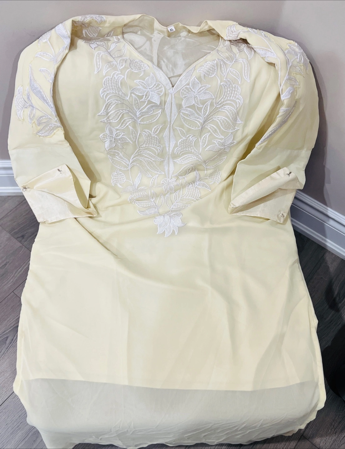 Here's a lovely lemon cream-coloured kaftan with beautiful white embroidery.