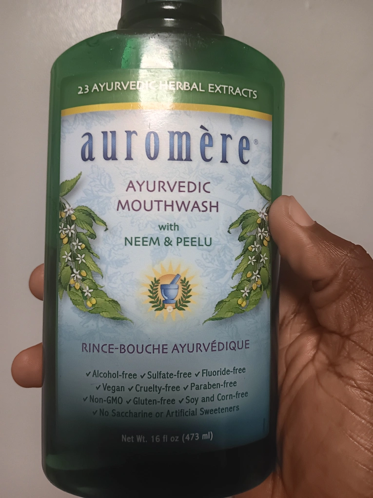 Selling a bottle of Auromère Ayurvedic Mouthwash with Neem & Peelu. It contains 23 Ayurvedic herbal extracts and is alcohol-free, sulfate-free, and fluoride-free. It's also vegan, cruelty-free, paraben-free, non-GMO, gluten-free, and soy and corn-free, with no saccharine or artificial sweeteners. Net weight is 16 fl oz (473 ml)