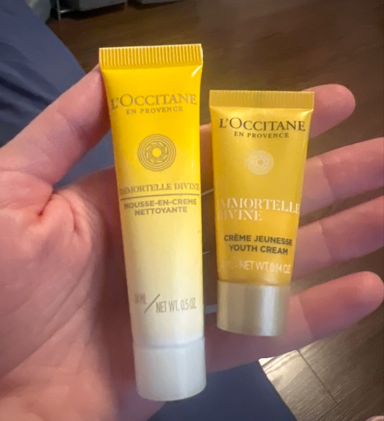 Selling a set of L'Occitane Immortelle Divine skincare products! You'll get both the Mousse-en-Creme Nettoyante (0.5 oz) and the Creme Jeunesse Youth Cream (0.14 oz). Perfect for trying out these lovely products from L'Occitane!
