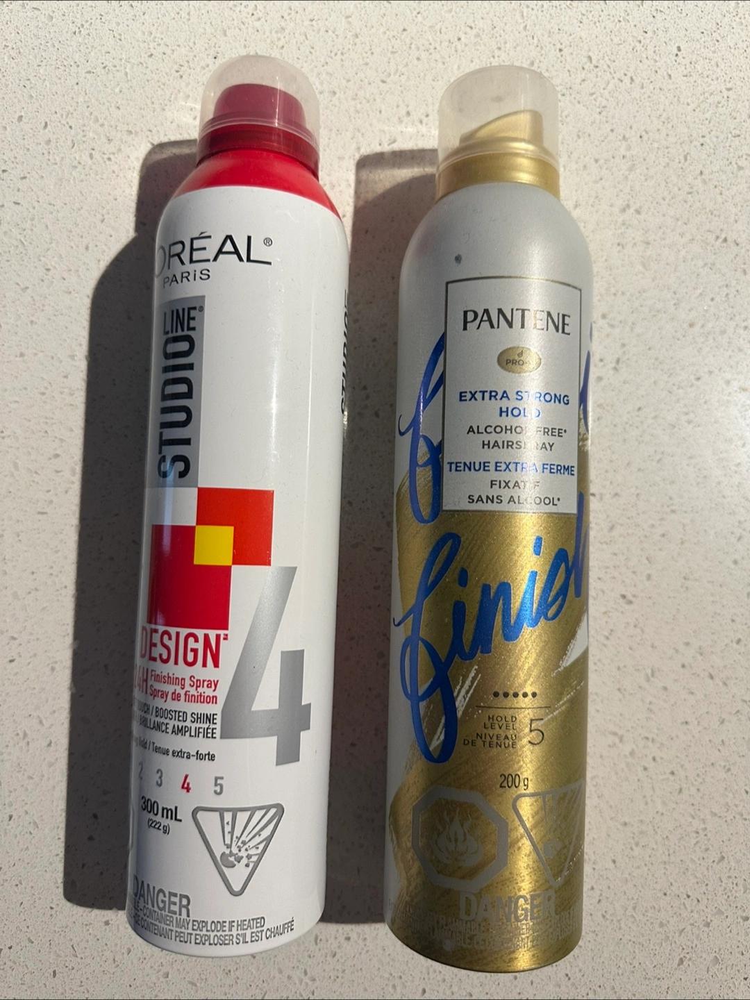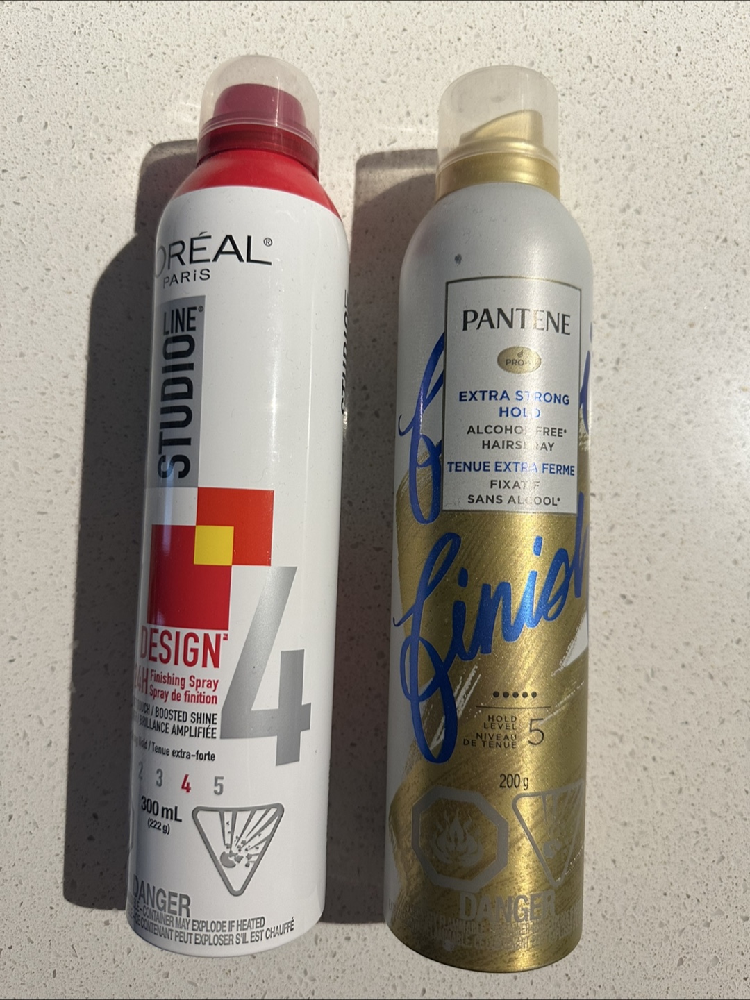 One is L'Oréal Studio Line Design Finishing Spray, and the other is Pantene Pro-V Extra Strong Hold Hairspray. The L'Oréal spray is 300ml, and the Pantene is 200g.