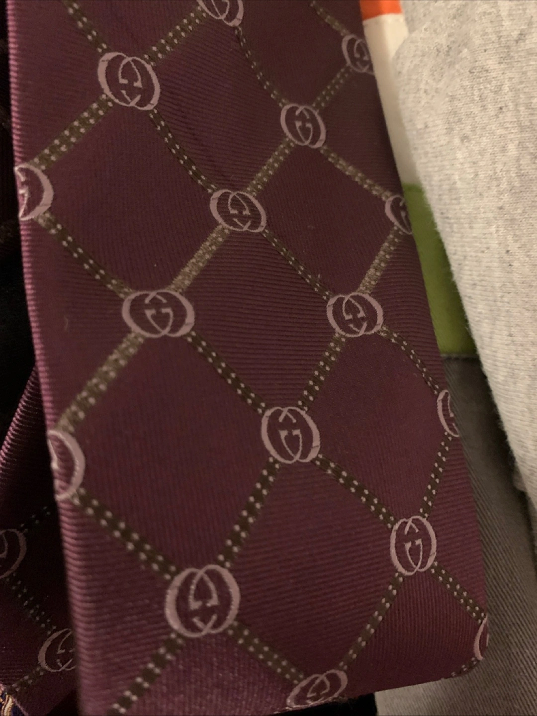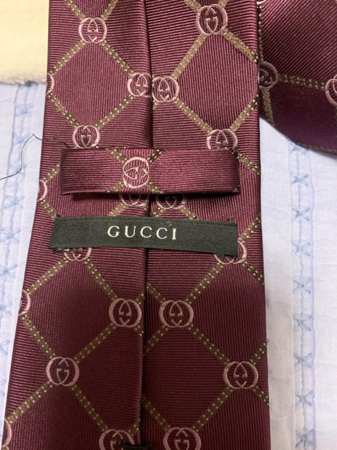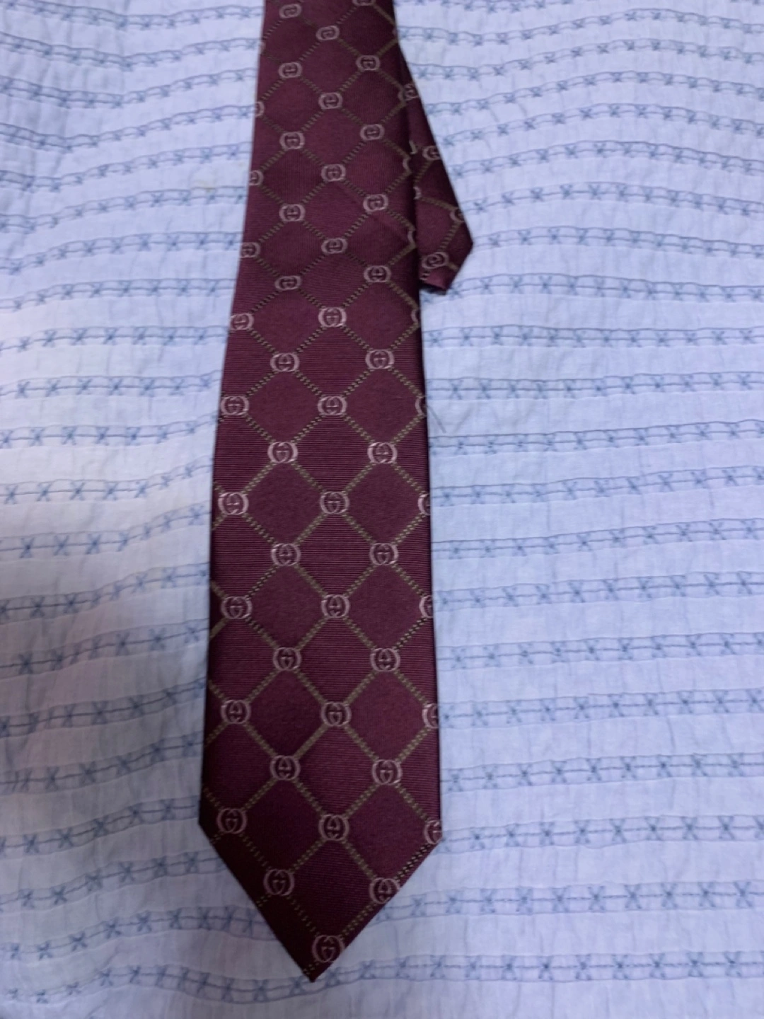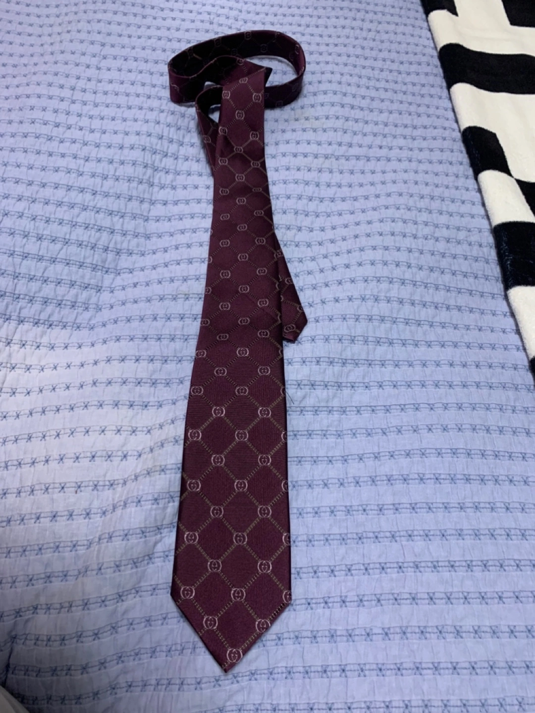 Selling a stylish Gucci tie in a burgundy colour. It features the classic GG pattern throughout. A great accessory to elevate any outfit!