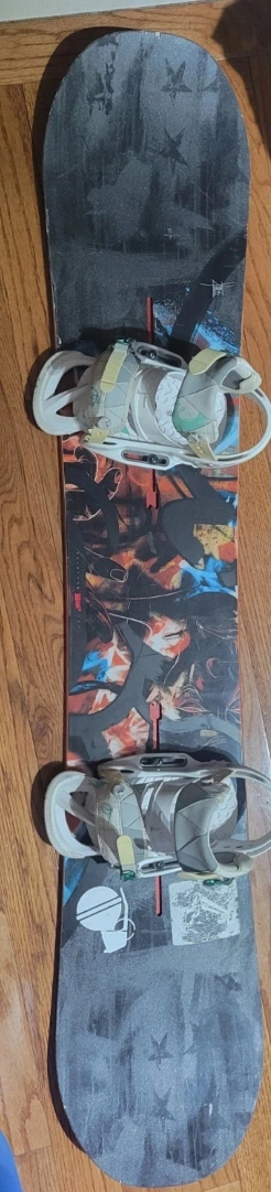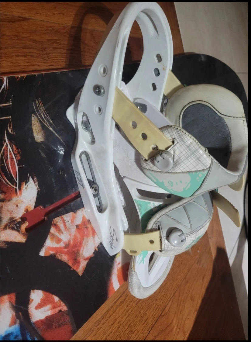 Includes boot mounts, two hooks to hang on the wall and a multitool to adjust the boot mounts. The soft case is large and quite roomy. The snowboard has small chips from natural use (see photo).