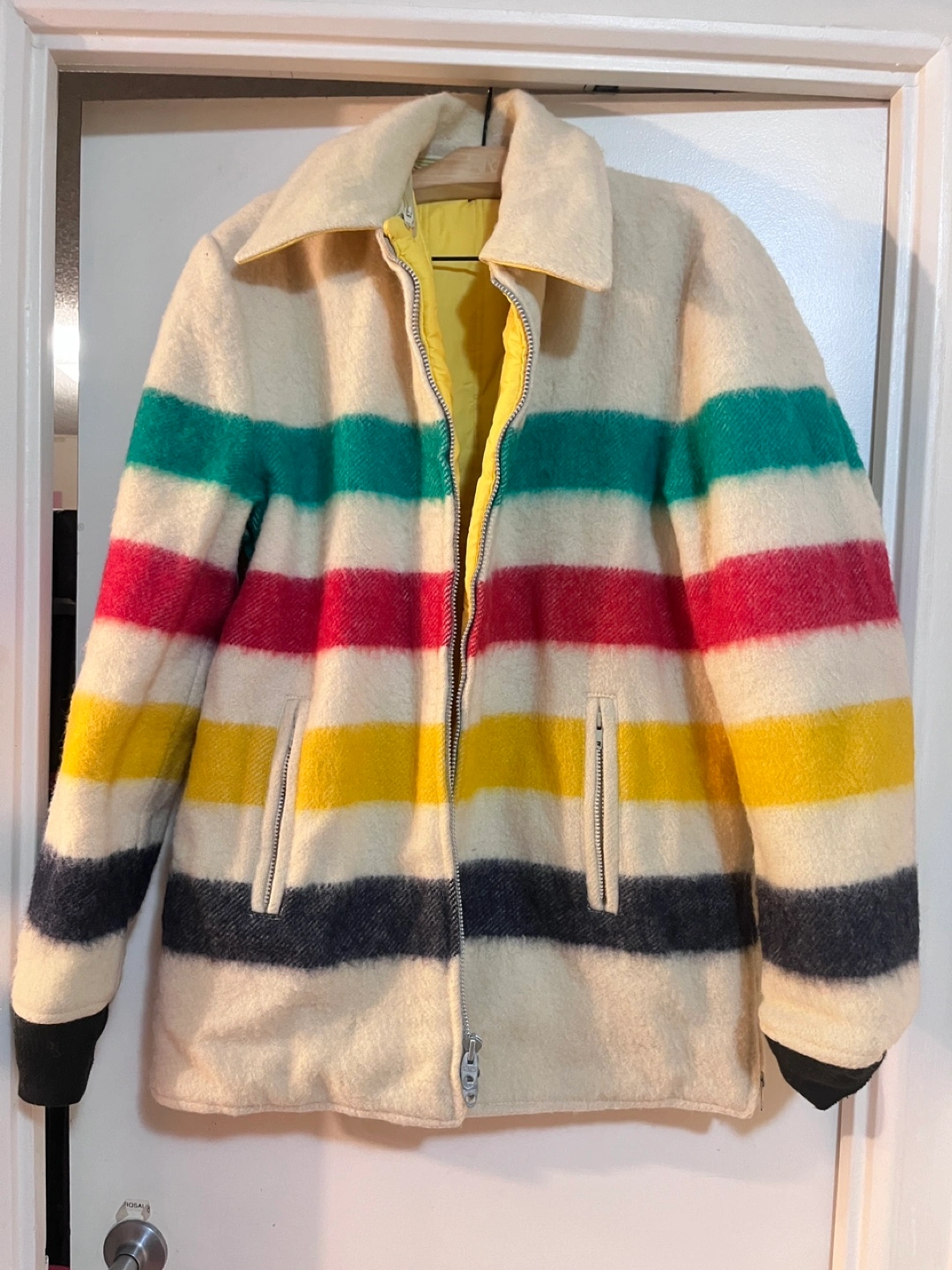 Selling a vintage Hudson's Bay wool point blanket parka. This iconic piece features the classic multi-stripe design and is perfect for staying warm during the colder months. It's in great condition and ready for a new home!