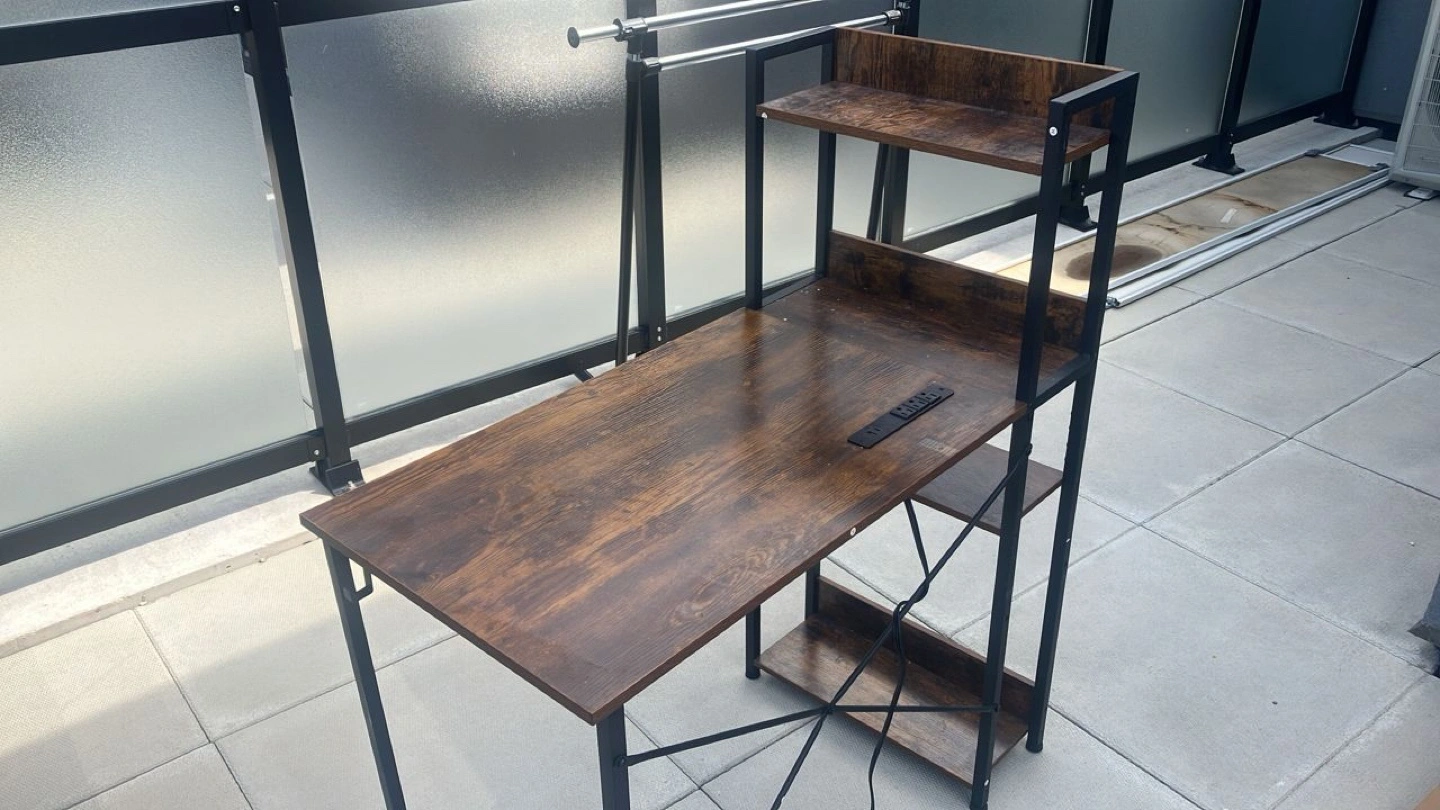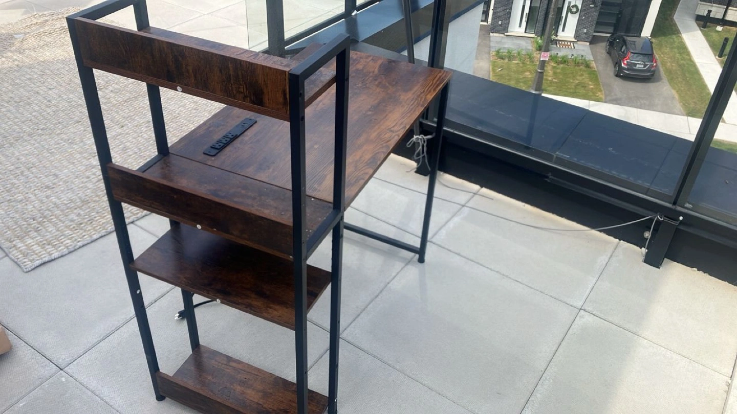 Looking to upgrade your setup? This gaming desk comes with built-in shelves, perfect for keeping your space organized. The desk is a nice brown colour and is in great condition. Dimensions are visible in the pictures!
