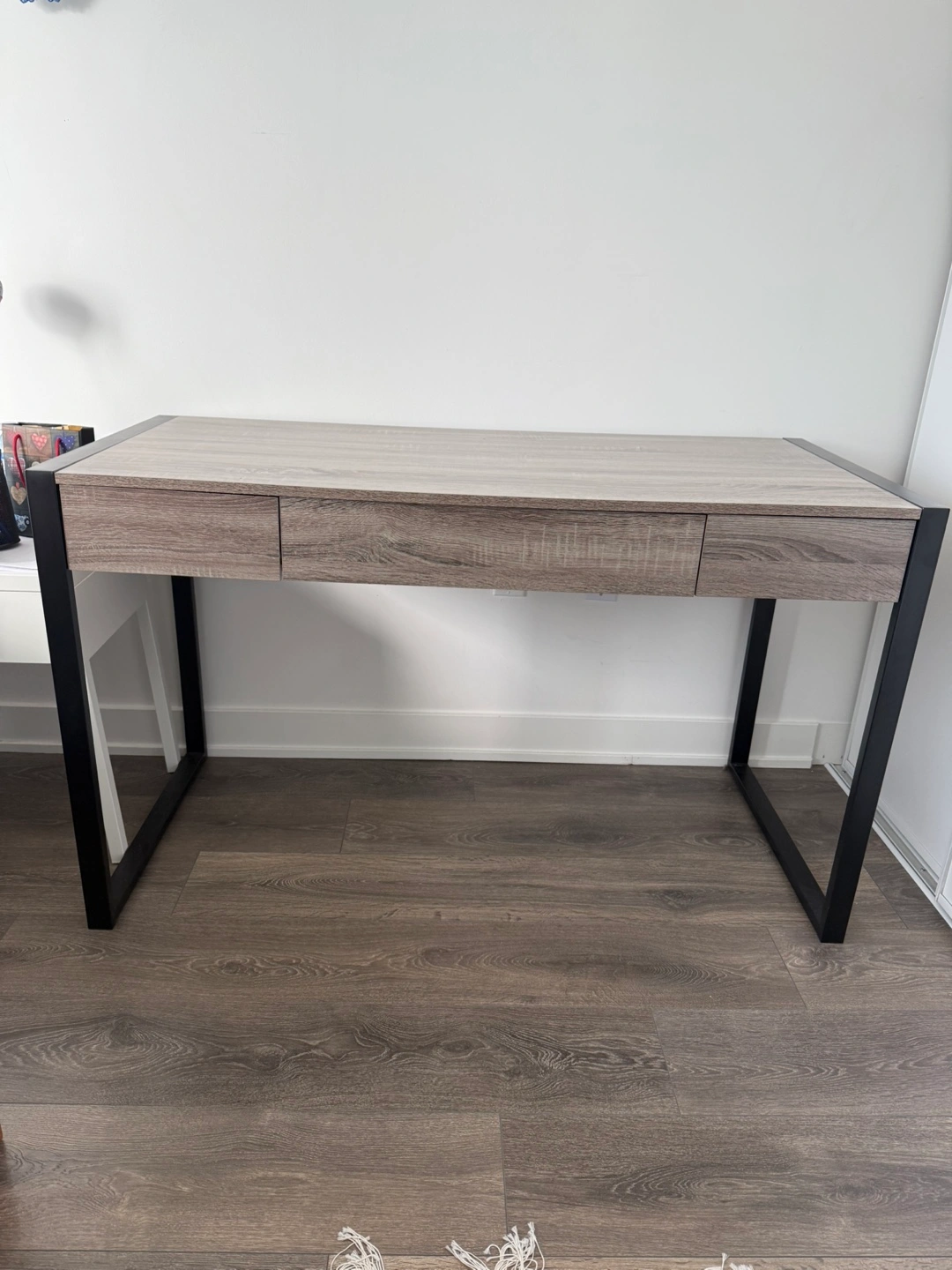 Selling a desk with a wood-look top and black metal legs. It features three drawers for storage. It's in great condition and would be perfect for a home office or study space