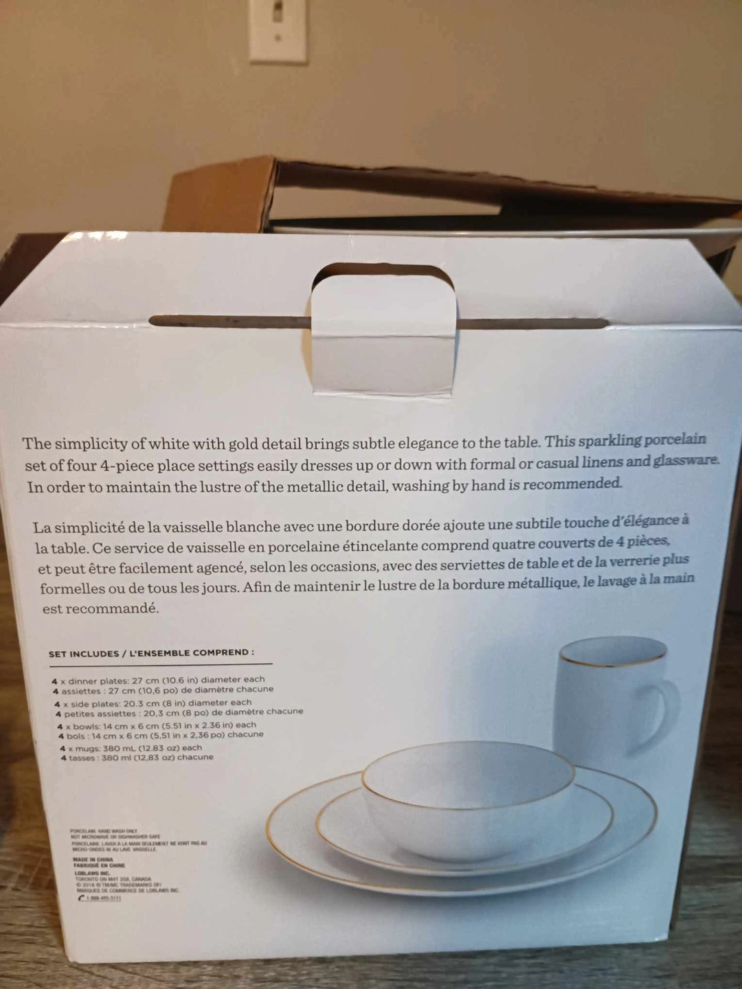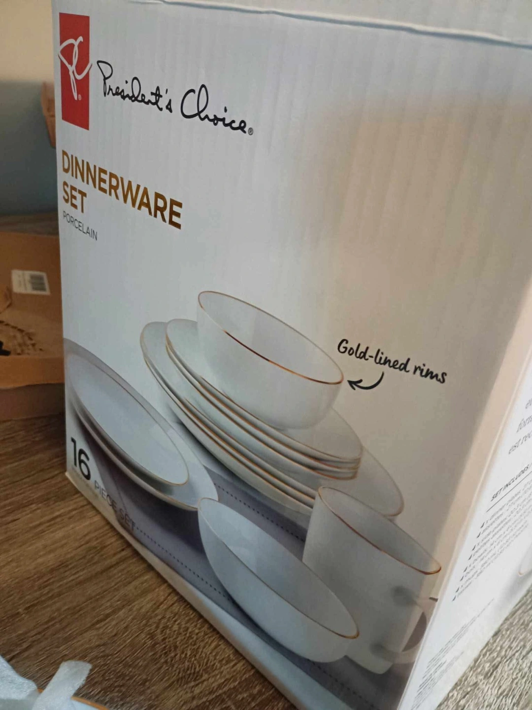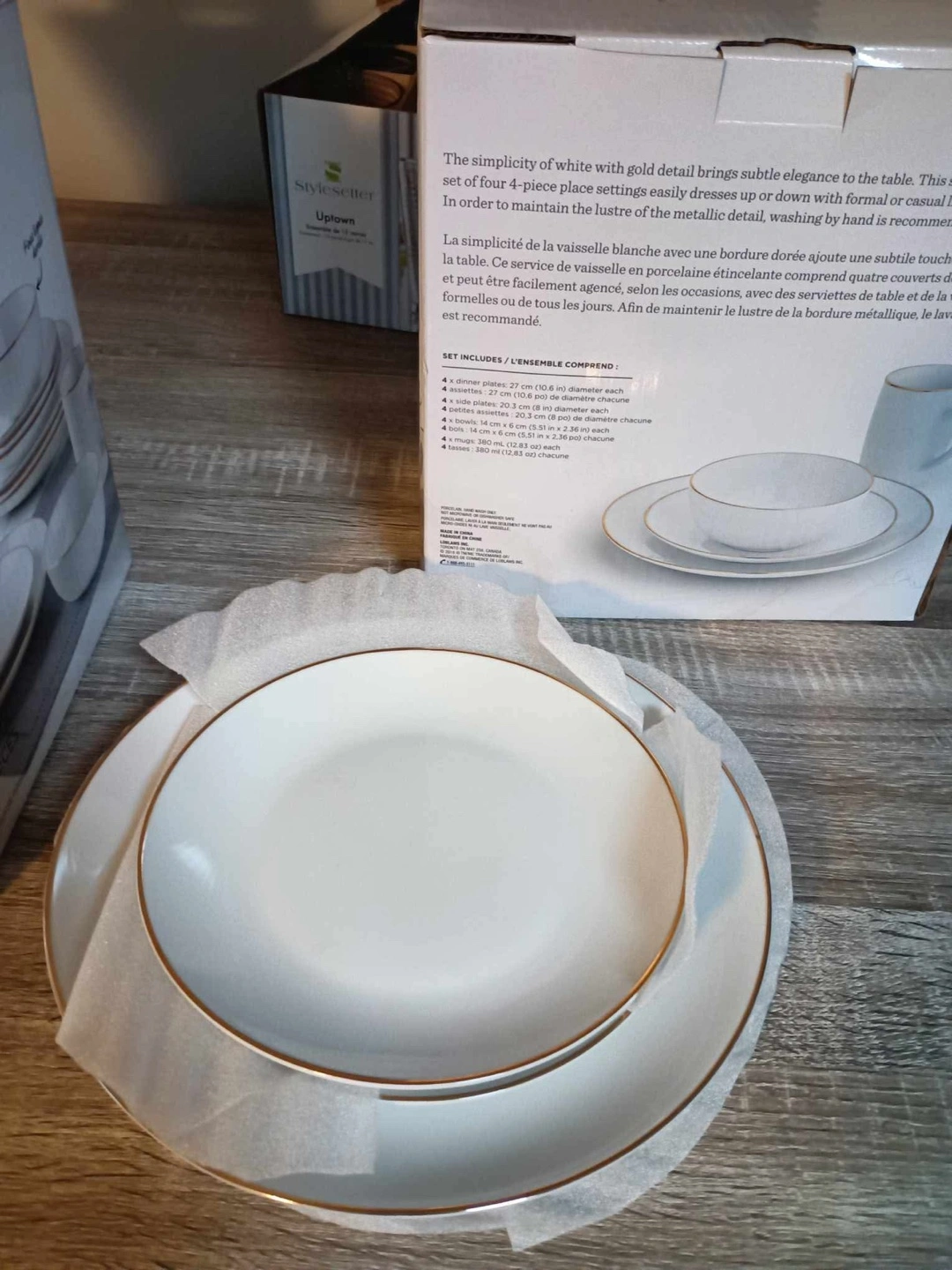 Selling a 16-piece porcelain dinnerware set from President's Choice. This set features a simple white design with elegant gold detailing, perfect for both formal and casual settings. The set includes four dinner plates, four side plates, four bowls, and four mugs. All pieces are in excellent condition and ready to elevate your dining experience!