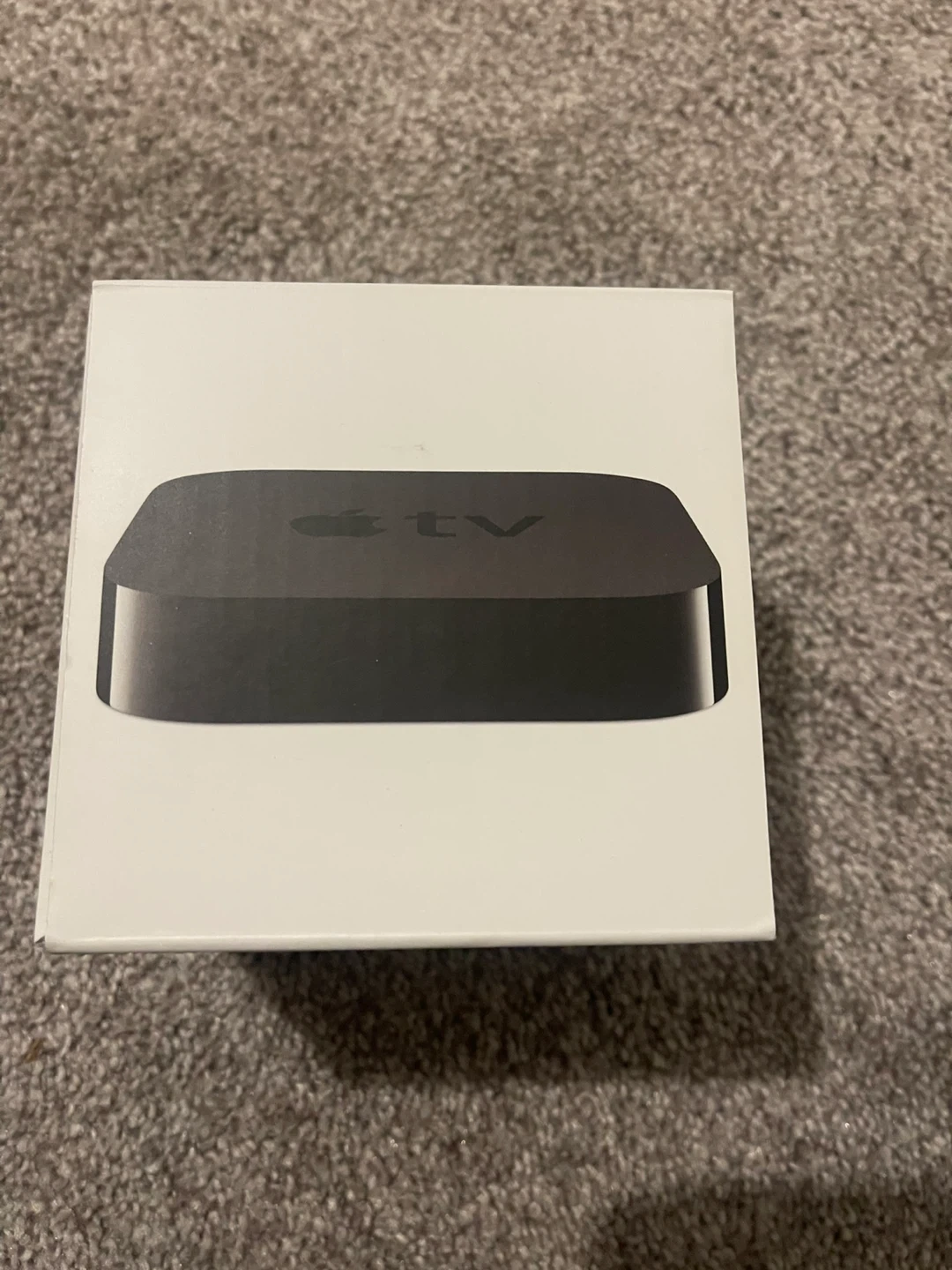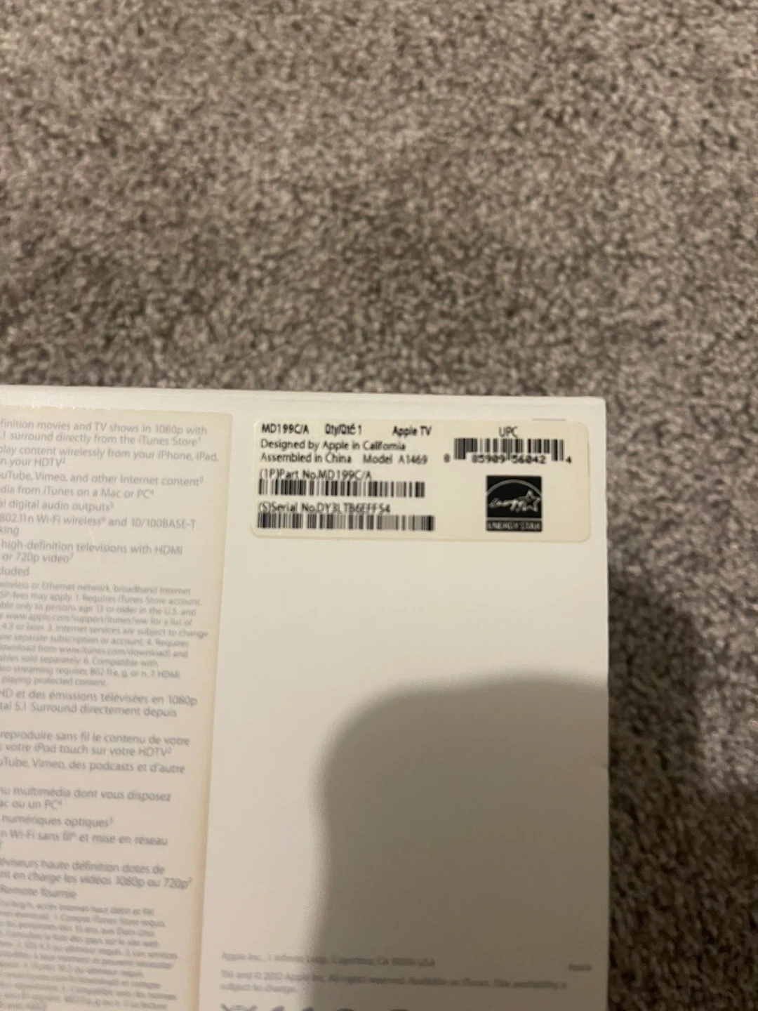 Apple TV MD199C/A model. High-definition televisions with HDMI and 720p video. Surround sound systems supported. Designed by Apple in California and assembled in Mexico.