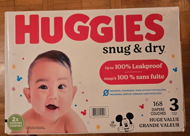 1000+Huggies Snug & Dry diapers! This is a HUGE value box with 168 diapers, size 3 (16-28 lb / 7-13 kg). They're designed for up to 100% leakproof protection and are made without parabens, fragrance, and phthalates