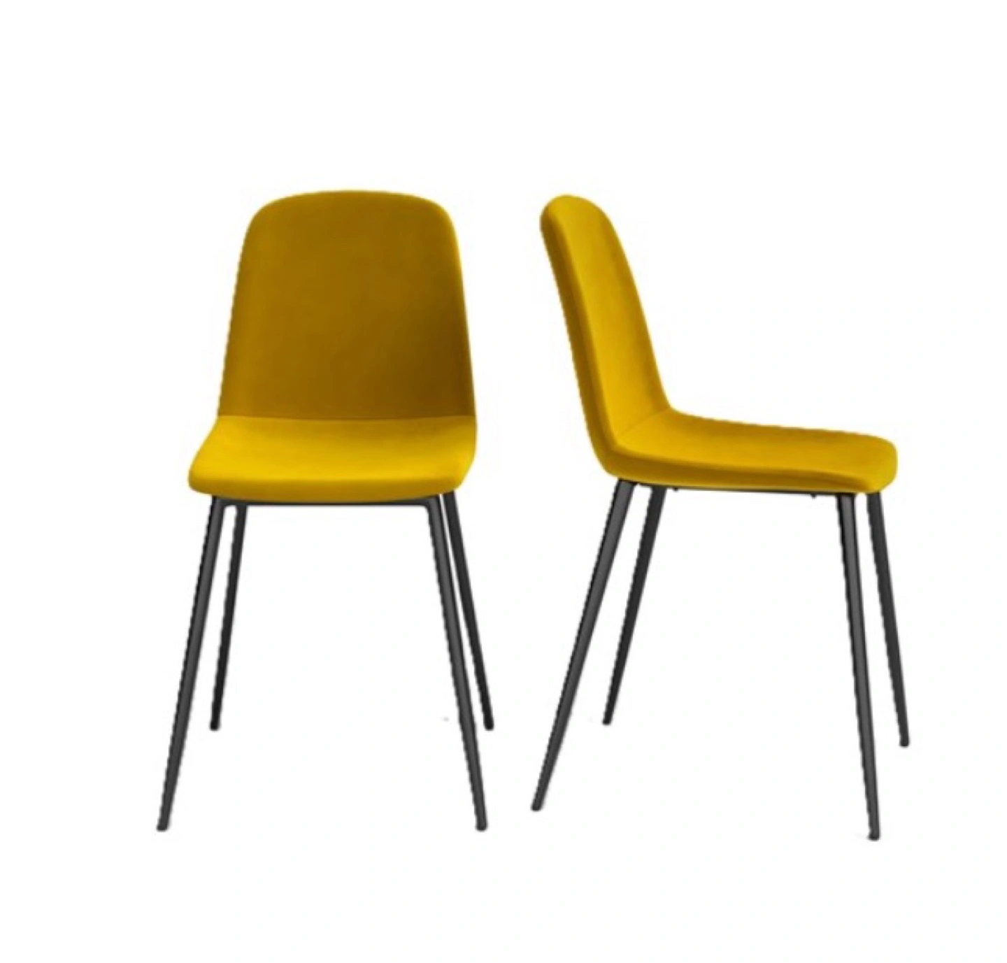 Selling a set of two stylish dining chairs! They feature a vibrant yellow velvet upholstery and sleek black legs. These chairs would add a pop of colour and modern touch to any dining space.