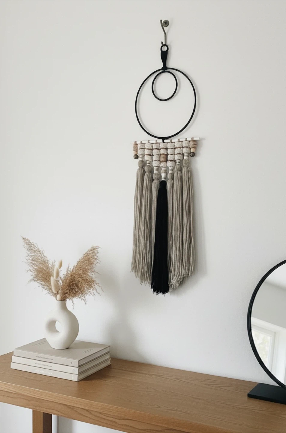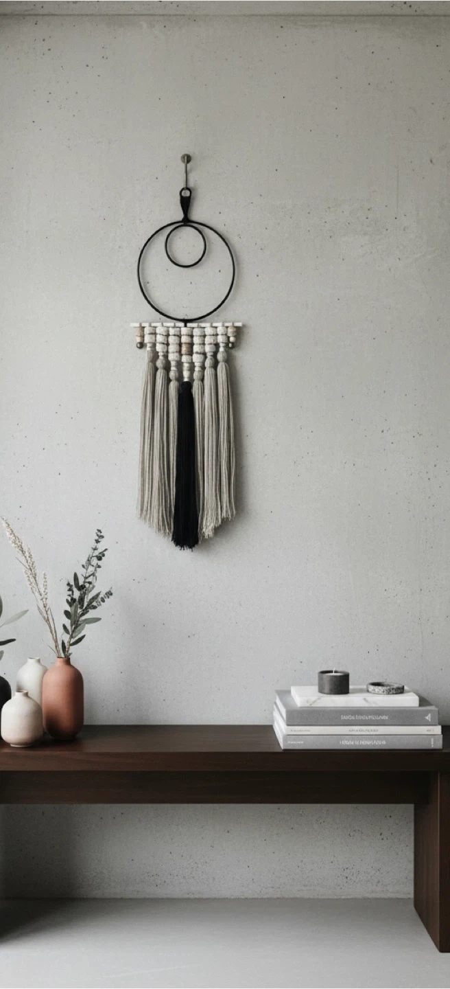 •Transform your space with the soothing presence of this Fiber Wall Hanging, a bold yet elegant fusion of minimal bohemian style and handcrafted fiber detail.