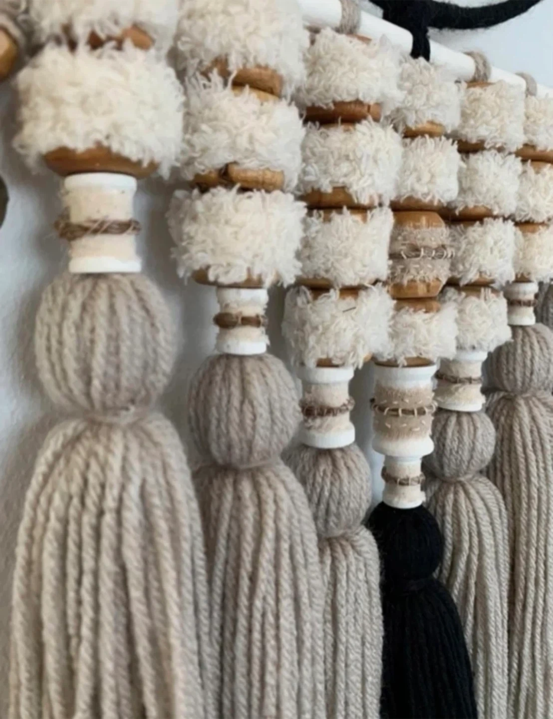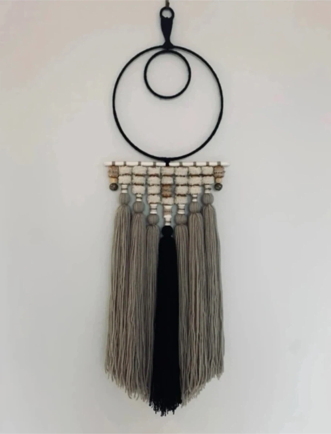 •Featuring a palette of neutral shades and hand-made wooden bead accents, this piece offers natural warmth and serene beauty. A lovely addition to any room.