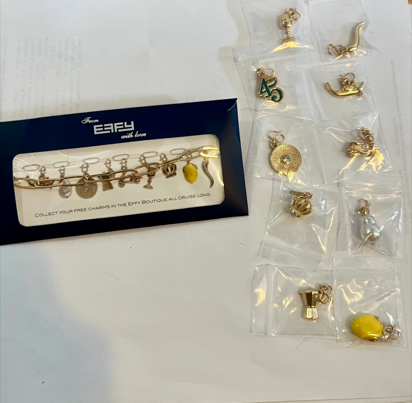 320This Effy bracelet comes with a variety of gold-tone charms, still in their original packaging! The bracelet itself is a link chain with an adjustable closure. It's a fun and unique piece to add to your collection From MSC cruise ship