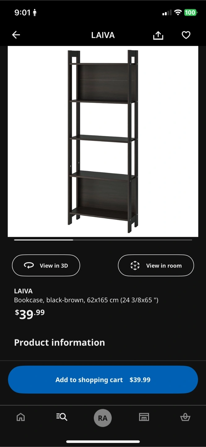 Selling a LAIVA bookcase from IKEA in black-brown. It's in great shape and ready for a new home! The dimensions are 62x165 cm (24 3/8x65 "). Originally bought brand new for $39.99