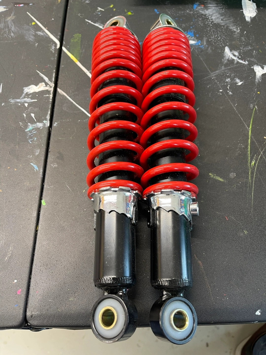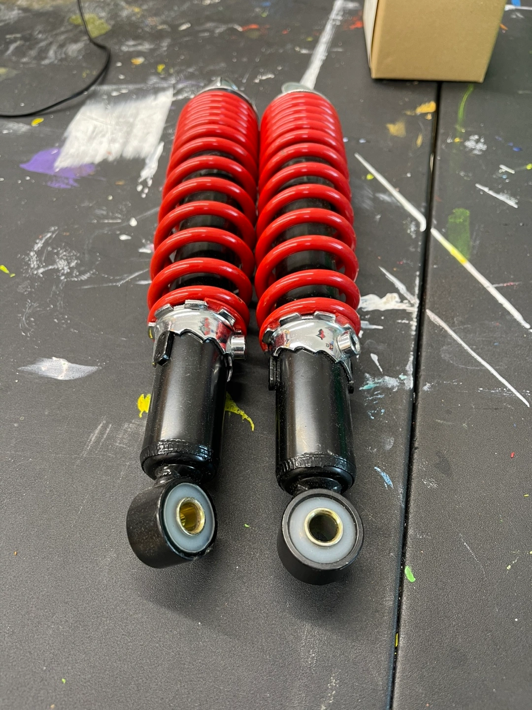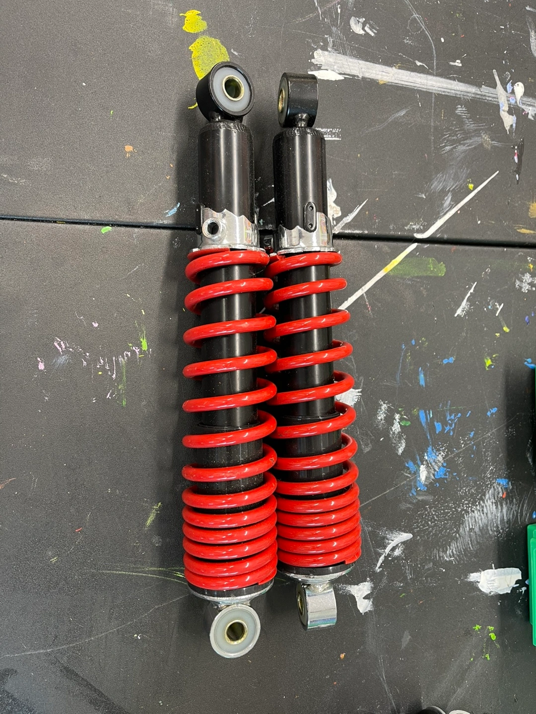 Selling a pair of motorcycle shock absorbers with vibrant red springs! They appear to be in good condition and ready to give your ride a smoother feel