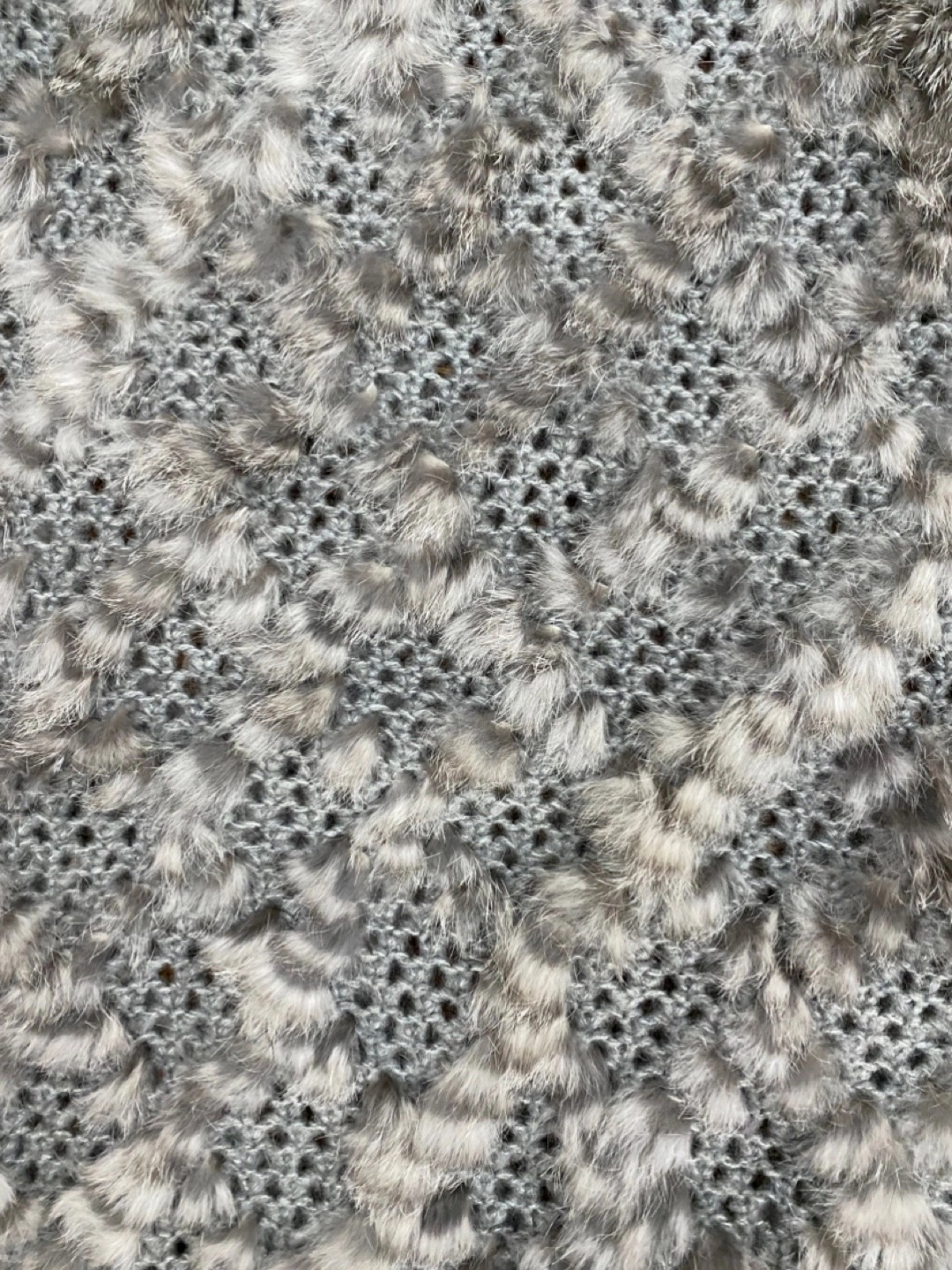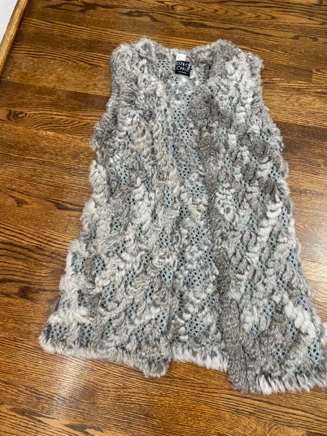 Selling a knitted Dolce Cabo vest made with real dyed rabbit fur. Hook and eye closures It's a size medium and has a unique, stylish look!