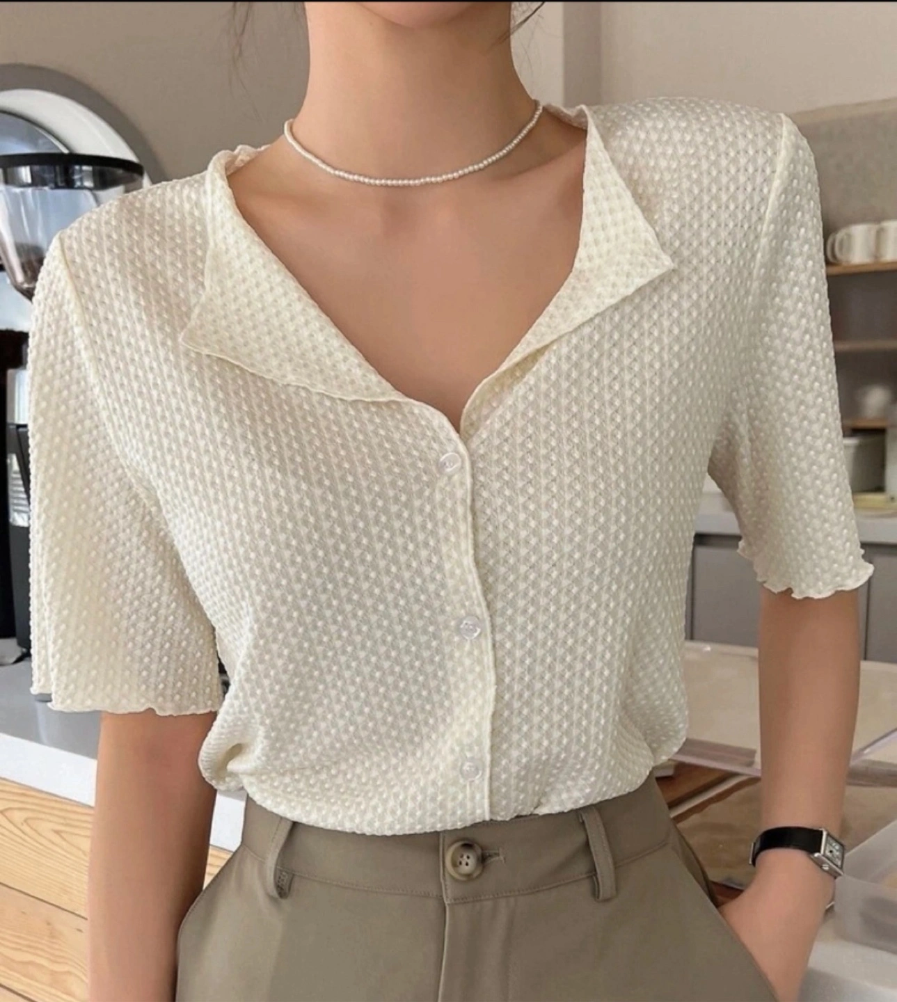 A lovely cream-coloured button-down blouse! It's in great condition and ready for a new home. The material has a unique textured pattern that adds a touch of elegance