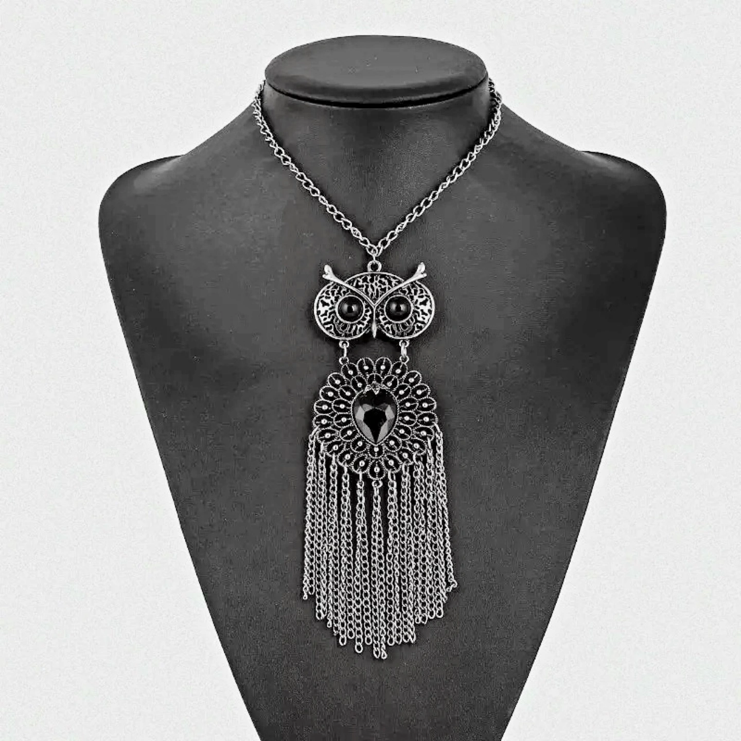 34Selling a unique owl pendant necklace. It features an intricate owl design with a black stone accent, complemented by a cascading fringe of silver-tone chains. A stylish statement piece!