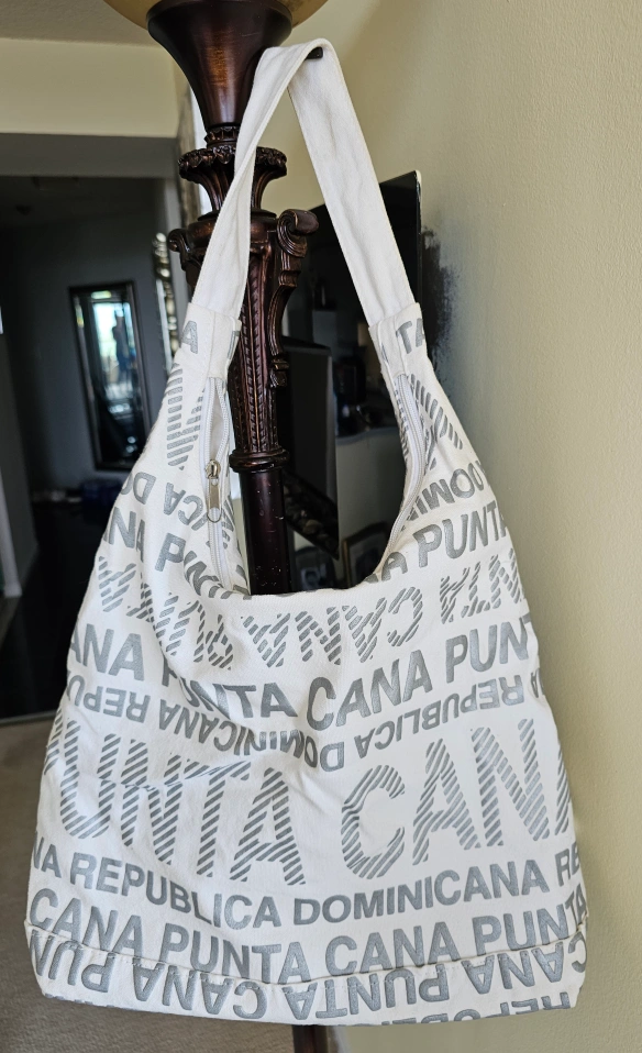 A fun ladies bag featuring 'Punta Cana Republica Dominicana' print! It's a great size for carrying your everyday essentials or using as a beach bag. The bag has a zipper for extra security. Straight from Punta Cana.