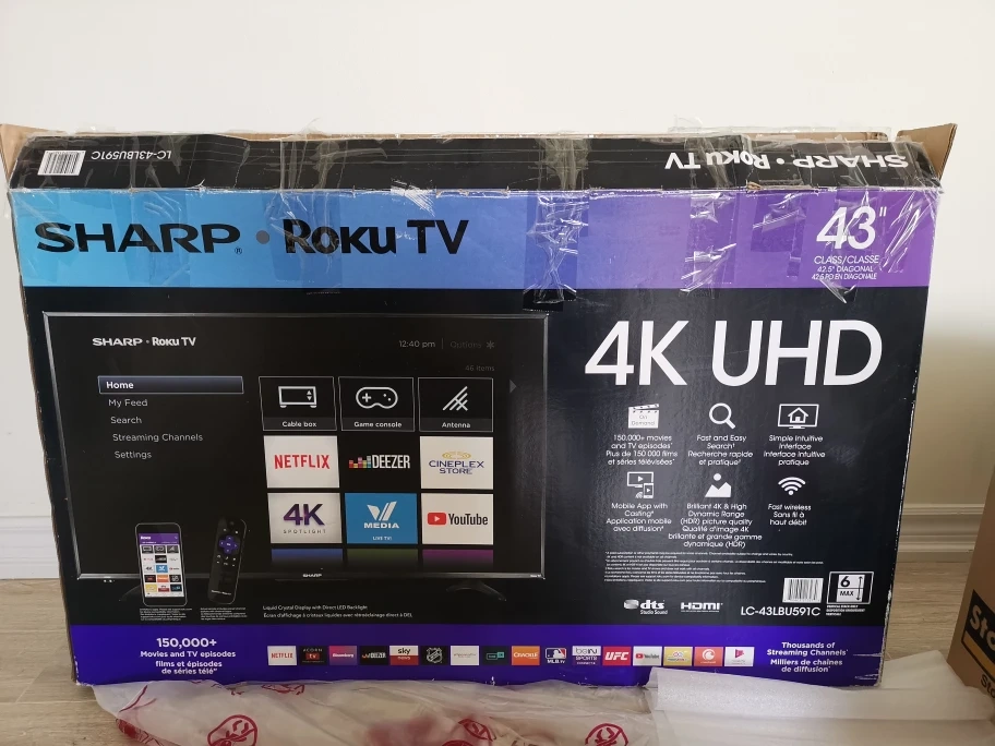 Selling a Sharp Roku TV, 43-inch screen size,! It's a 4K UHD model. The box is included, so it's easy to transport. Perfect for streaming all your favourite shows and movies! Pet and smoke free home