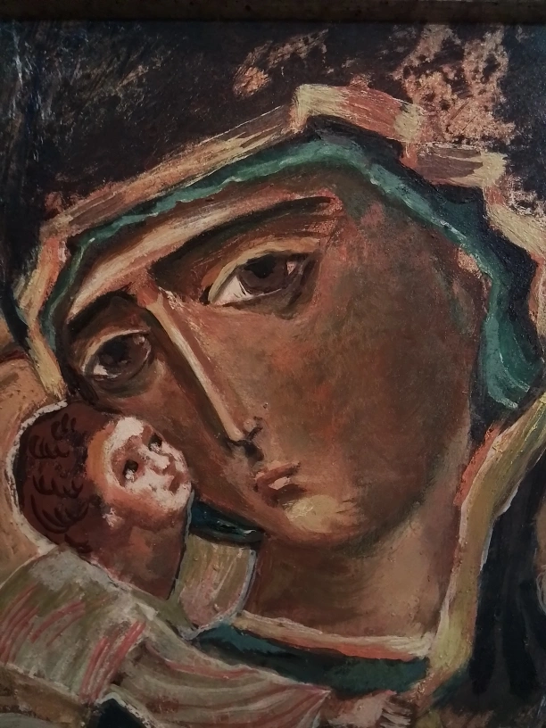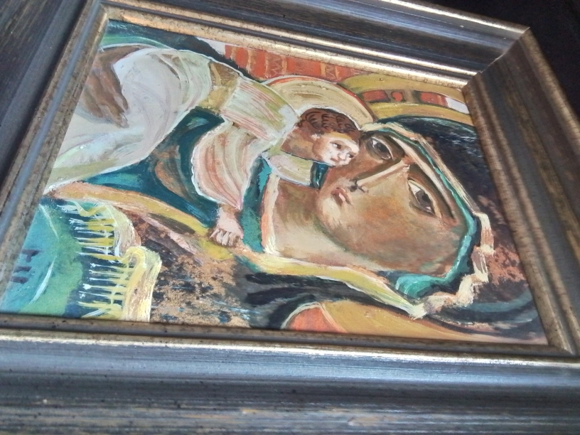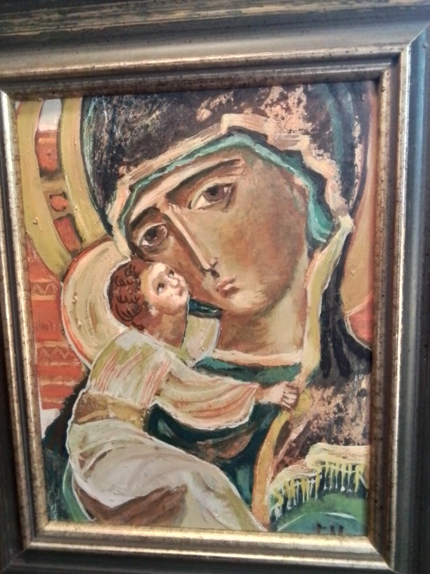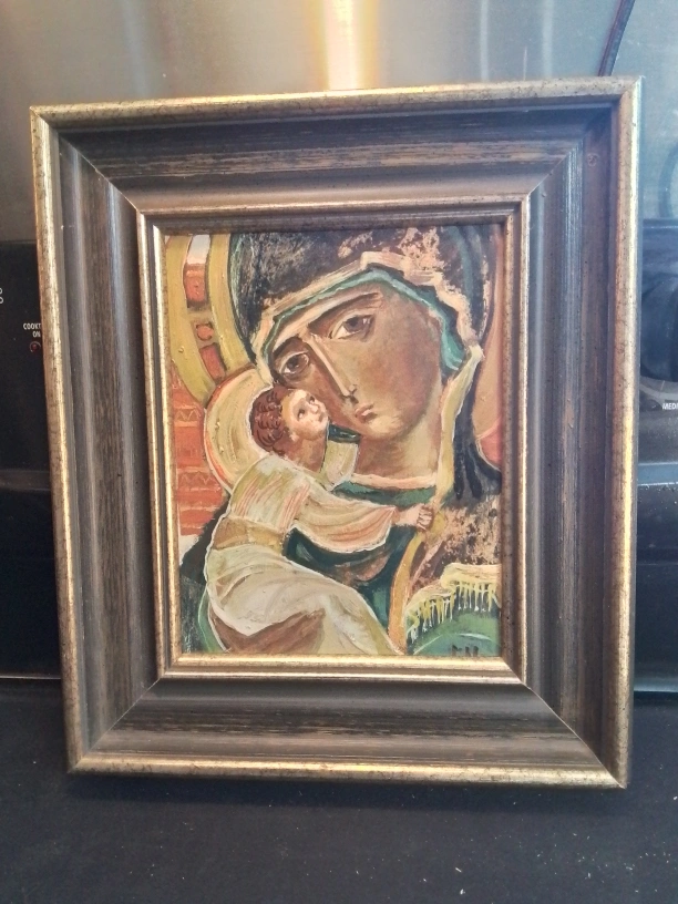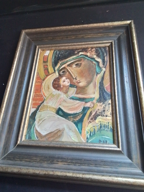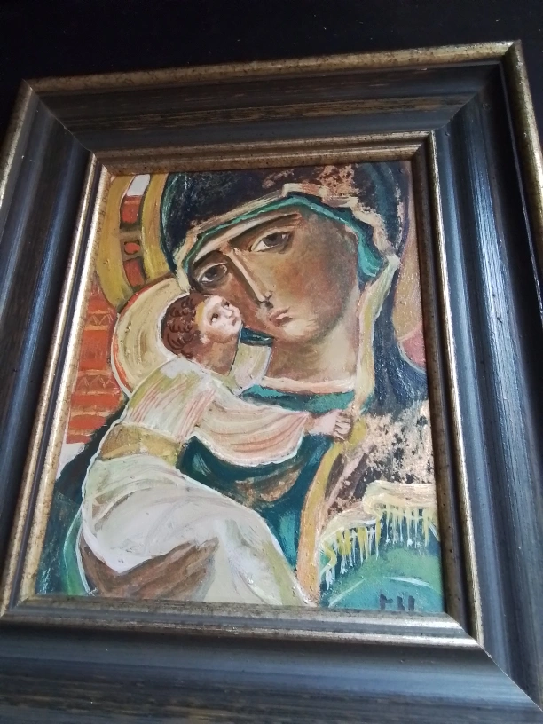 114Iconic Russian Avante Garde Style Madonna & Child Oil Paining Iconic Russian Avante Garde Style Madonna & Child Oil Paining On Board Artist Signed Excellent incredibly well-painted Measurements: 13.5" x 11.5" This is an iconic Russian Avante Garde style framed painting of the Madonna and Child. This painting is in excellent condition, showing signs of wear and age which add to its unique character. Its a piece that whispers stories of artistic innovation and profound connection. If the ad is up, then it's still waiting for its encore! Yonge Street and Steeles Avenue