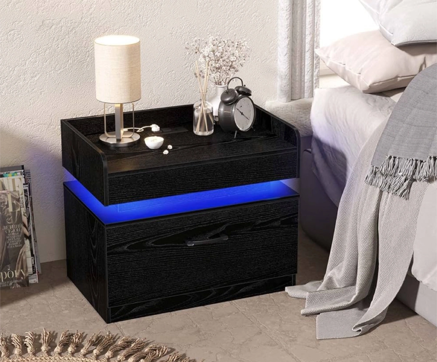 The color of the light strip is variable according to needs and scenes. The bedside nightstand comes with beautiful Multi-colour RGB LED backlight. It will look more beautiful when the light is in the dark. The beautiful LED light will make your home looks more modern and fashionable.