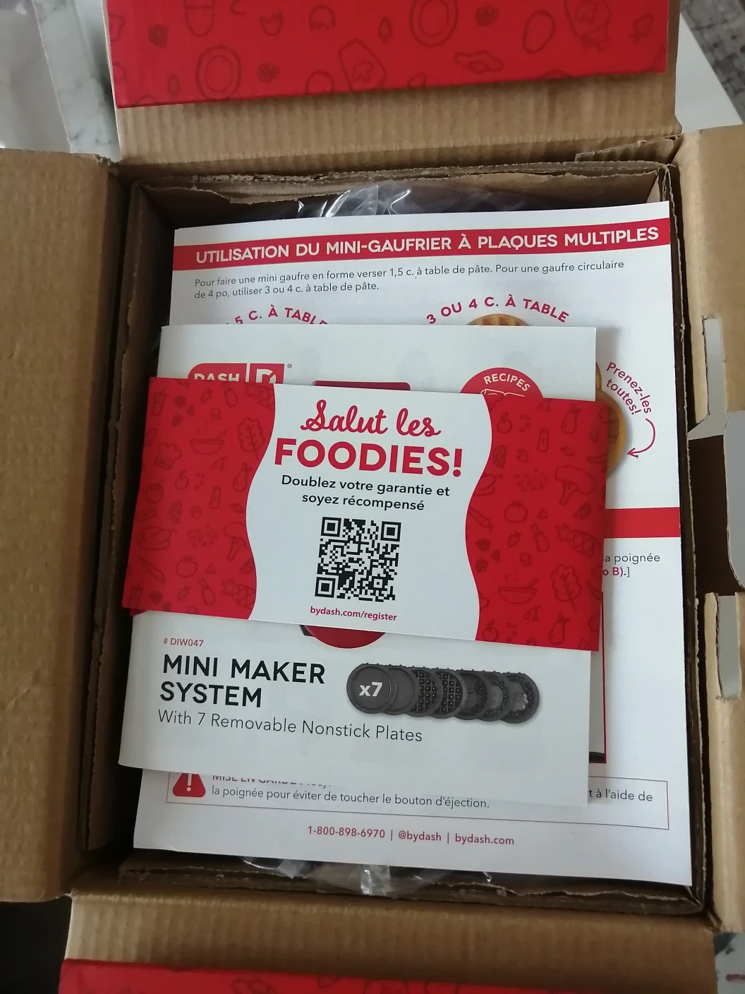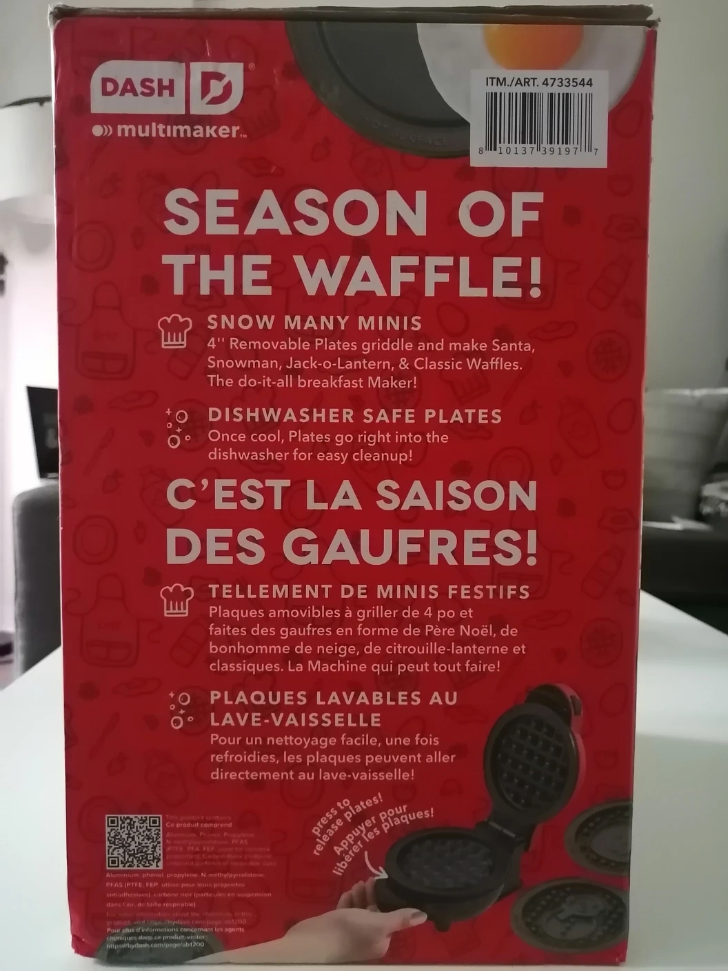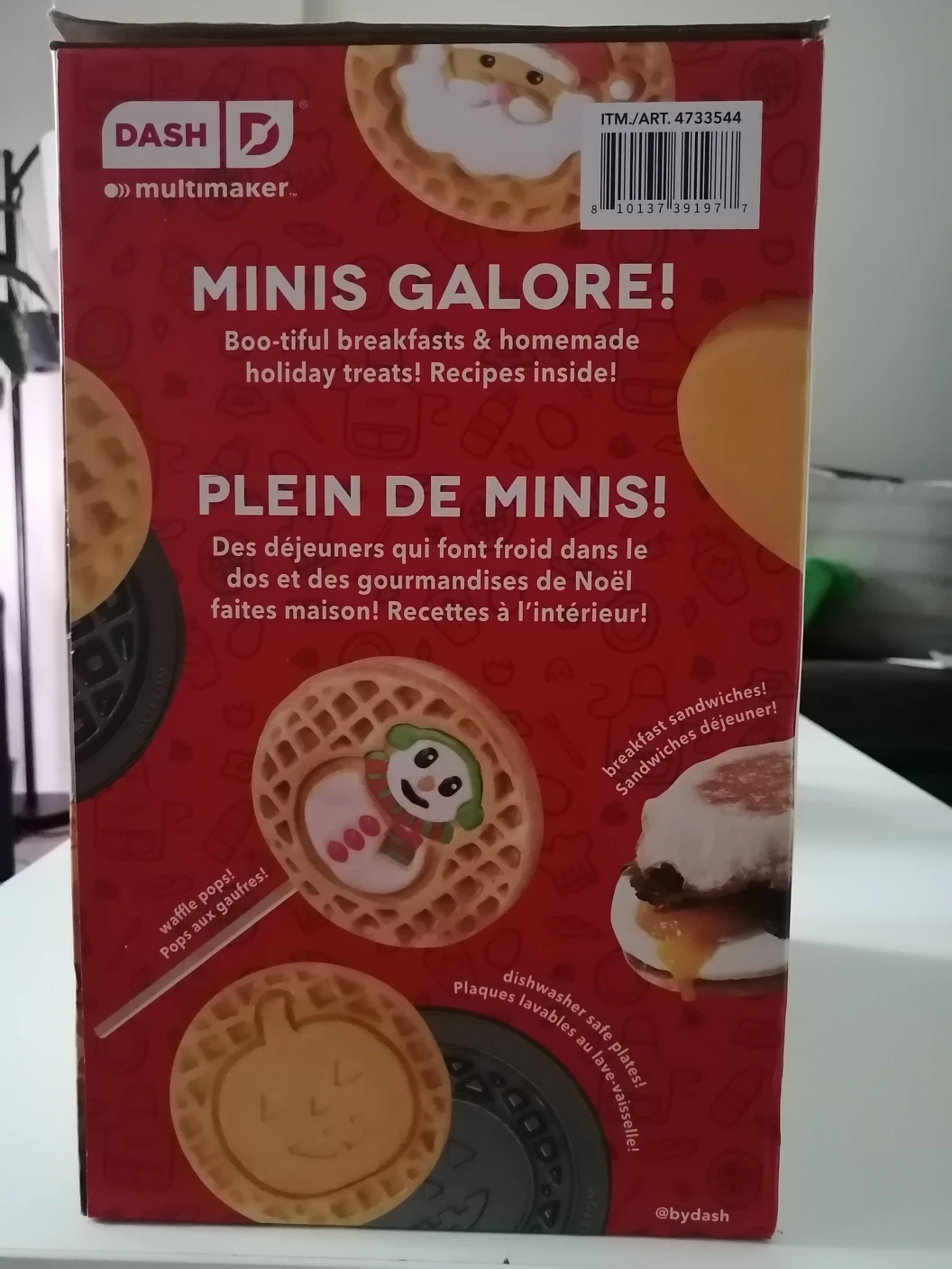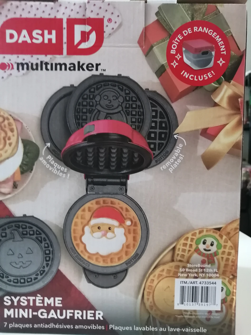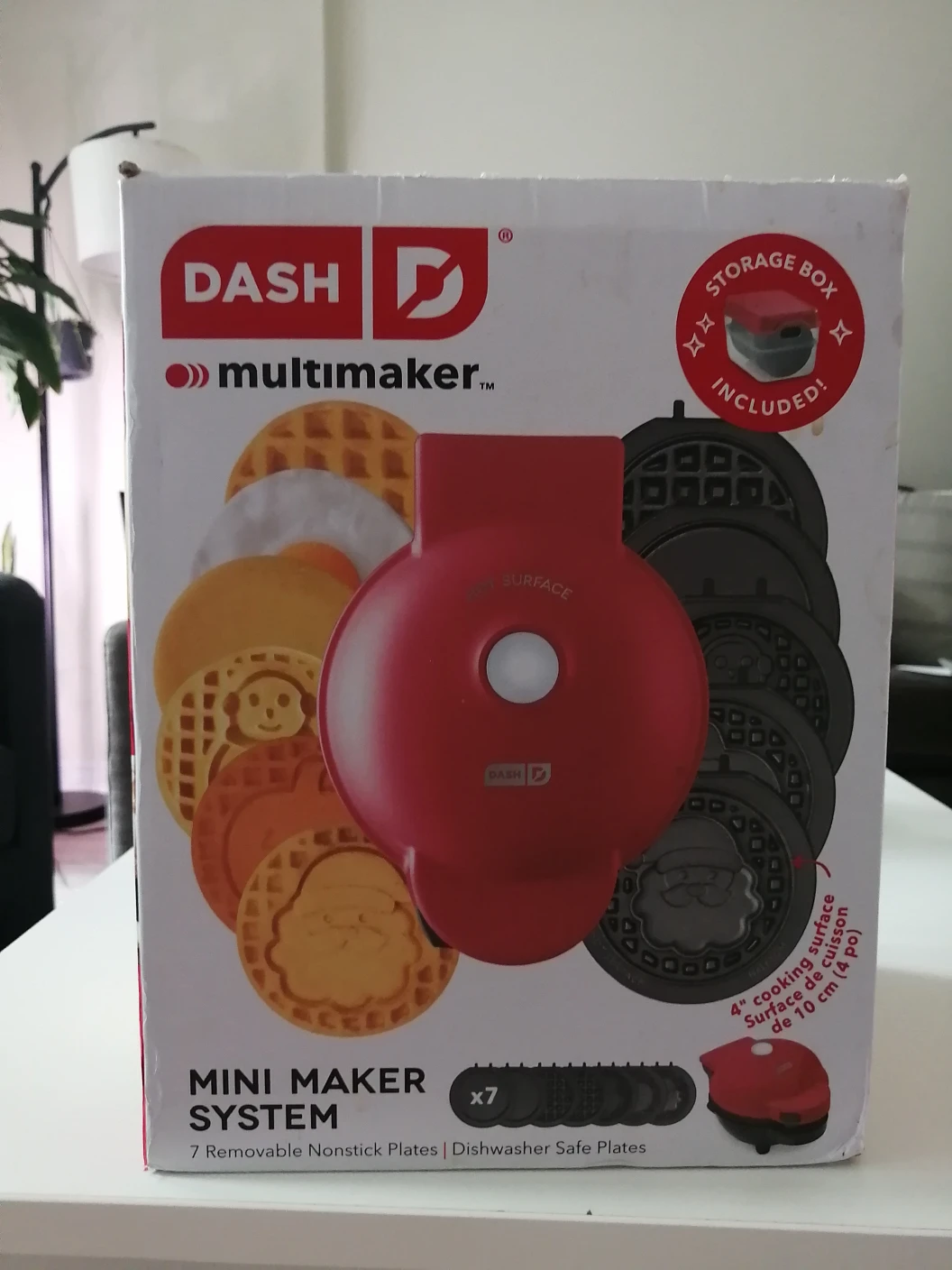Selling a never-used-before DASH multimaker Mini Maker System! It's missing one of the removable nonstick plates. The box includes a storage box for the plates. Make mini waffles in fun shapes.