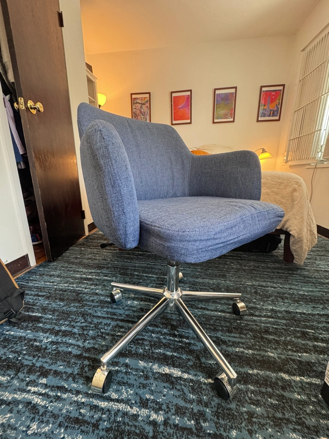 Selling a comfortable blue office chair. It's in great condition and ready for a new home. The chair features a sturdy base with rolling casters and a supportive back. It's perfect for a home office or study space!