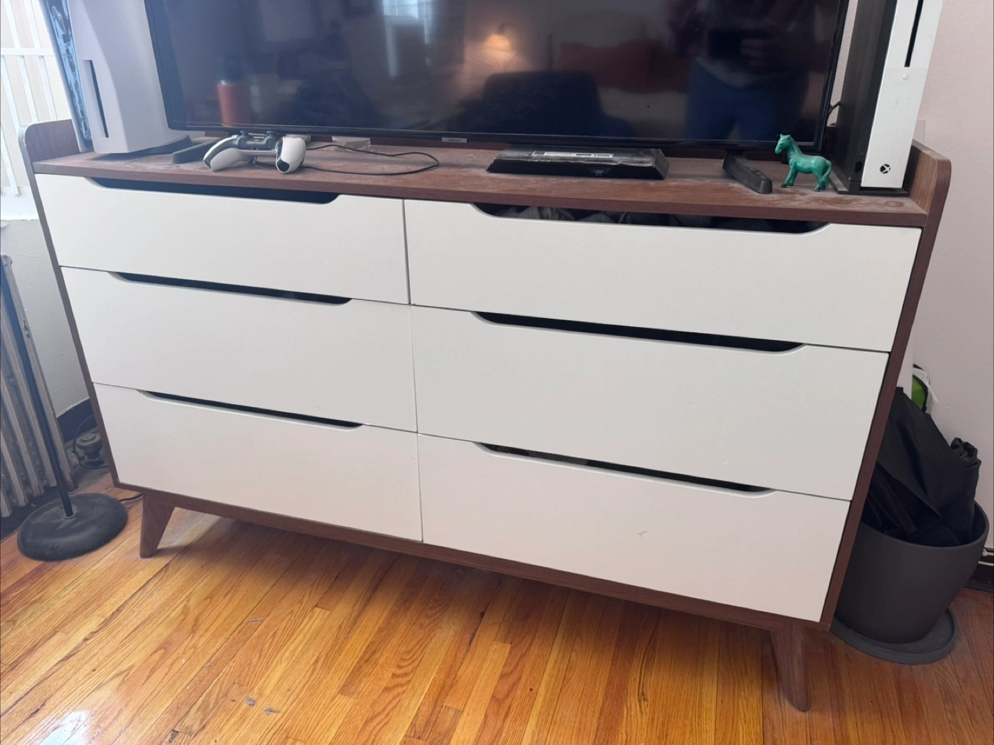 Selling a dresser with six drawers! It features a clean, modern design with a white finish and a wood-tone frame and legs. Perfect for adding storage to any bedroom or living space